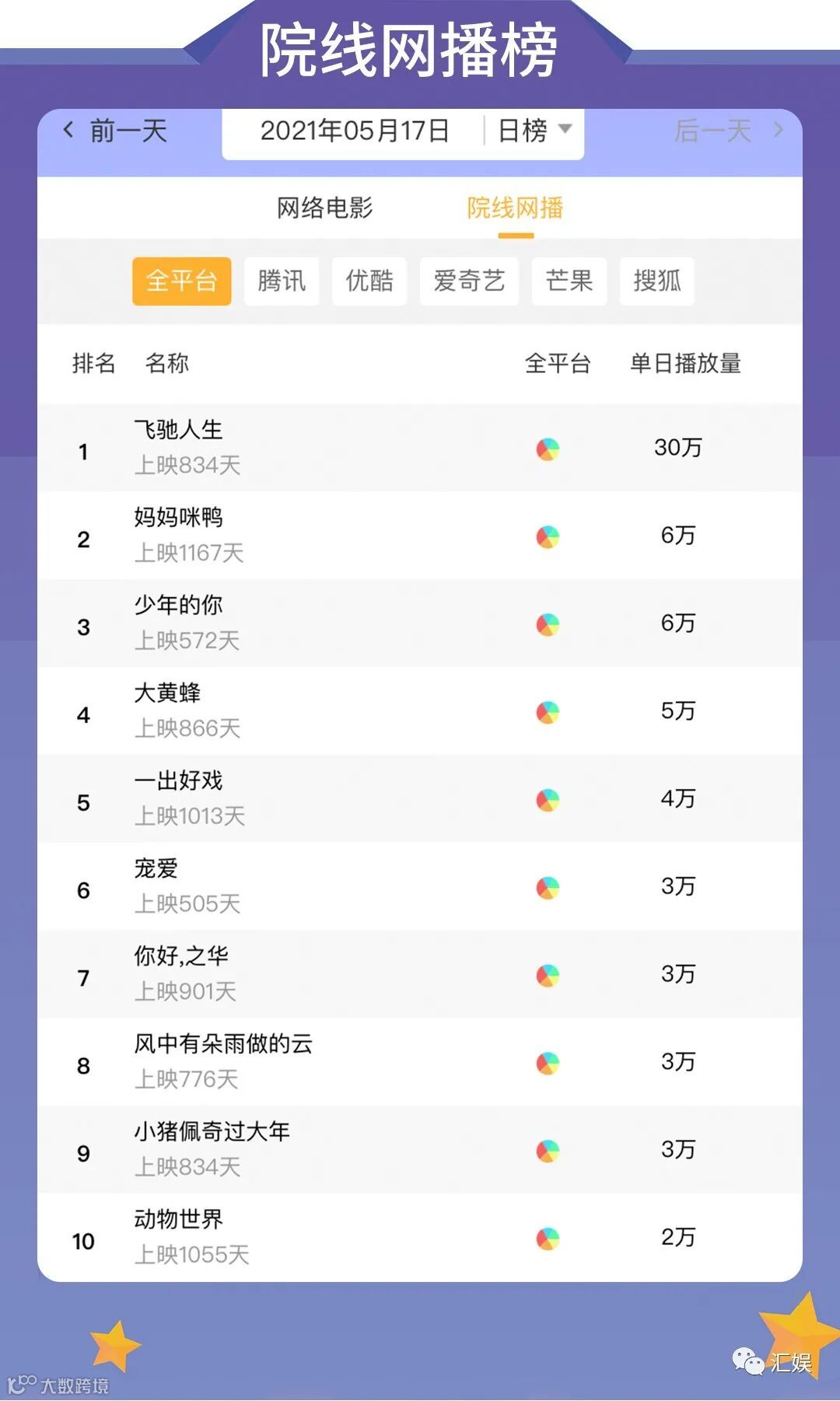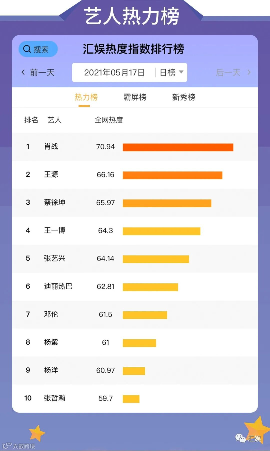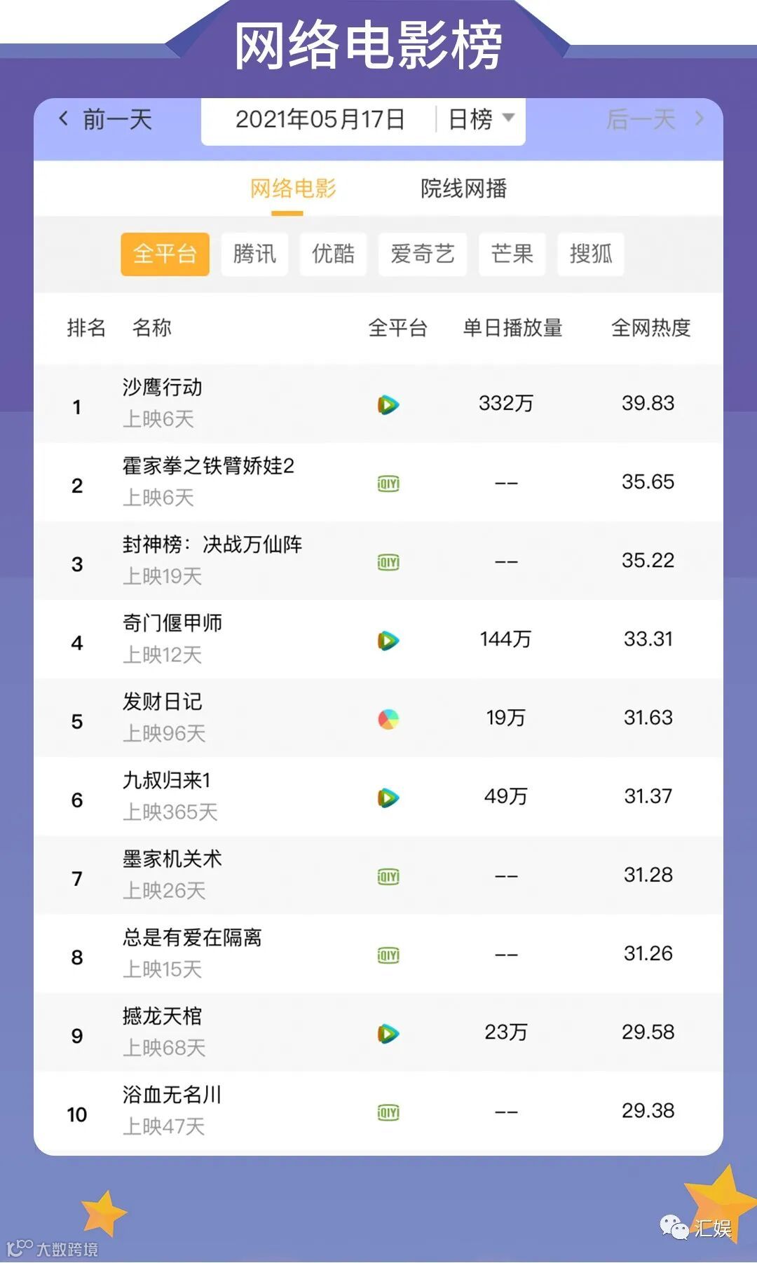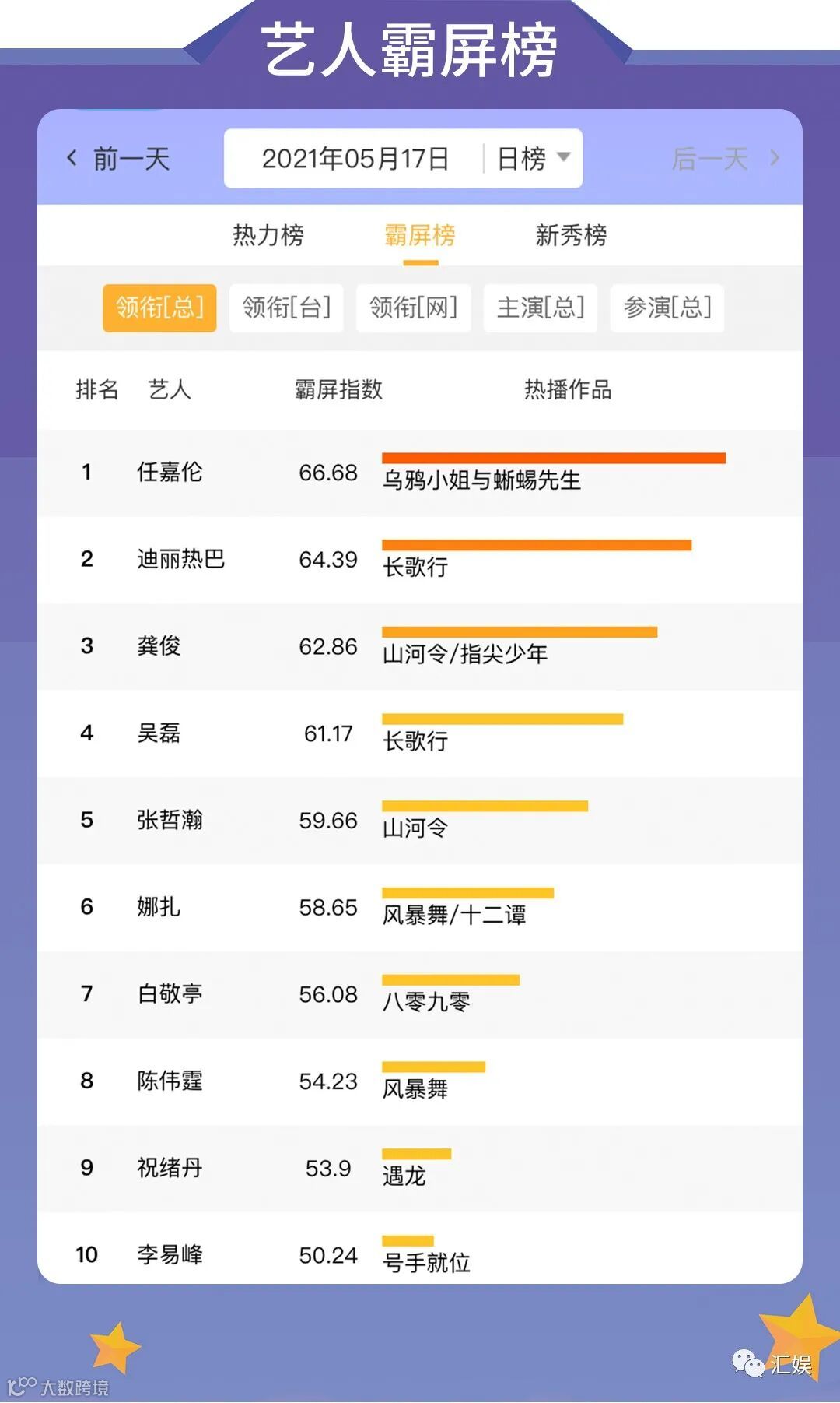 汇娱数据 | 2021.05.17 剧集、综艺、艺人全网平台热度指数