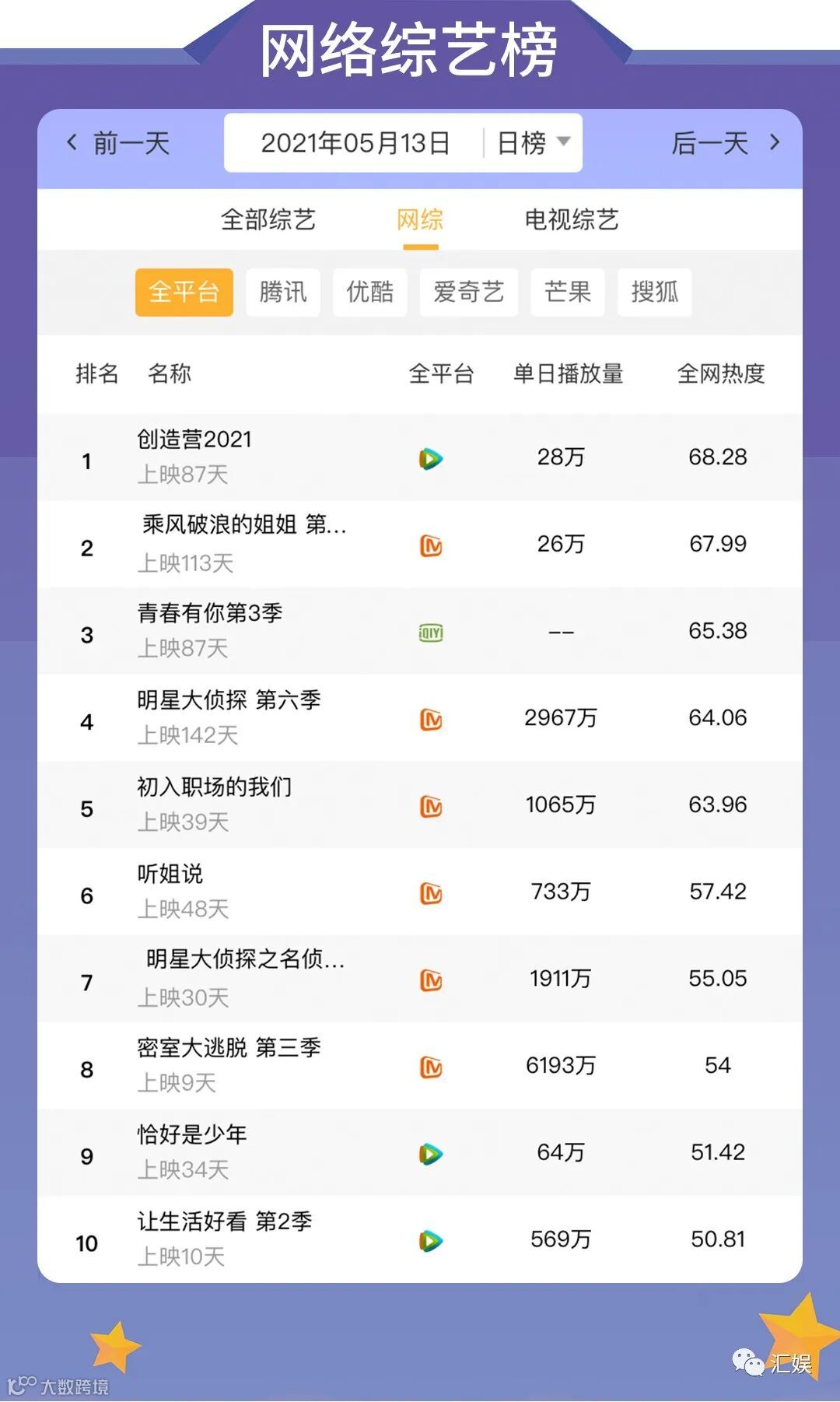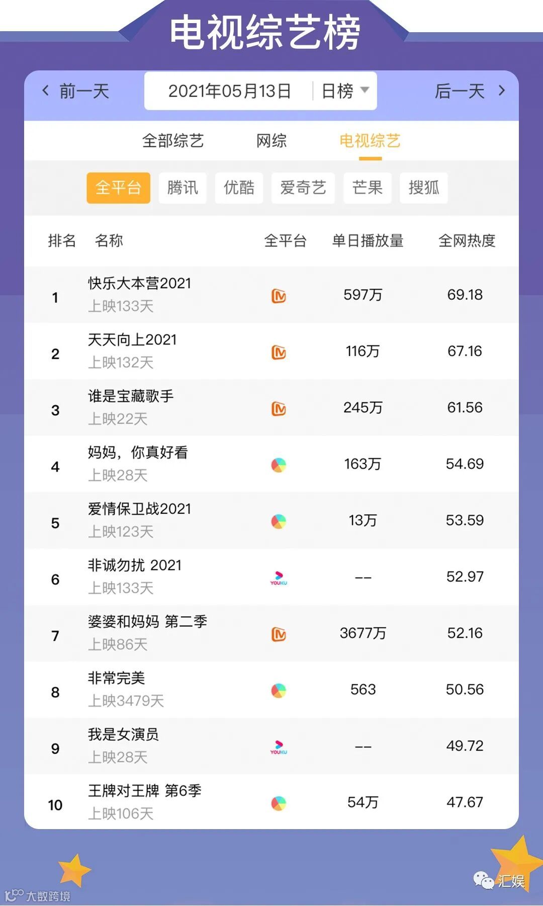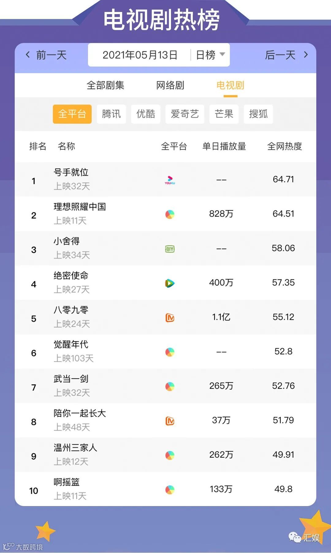 汇娱数据 | 2021.05.13 剧集、综艺、艺人全网平台热度指数
