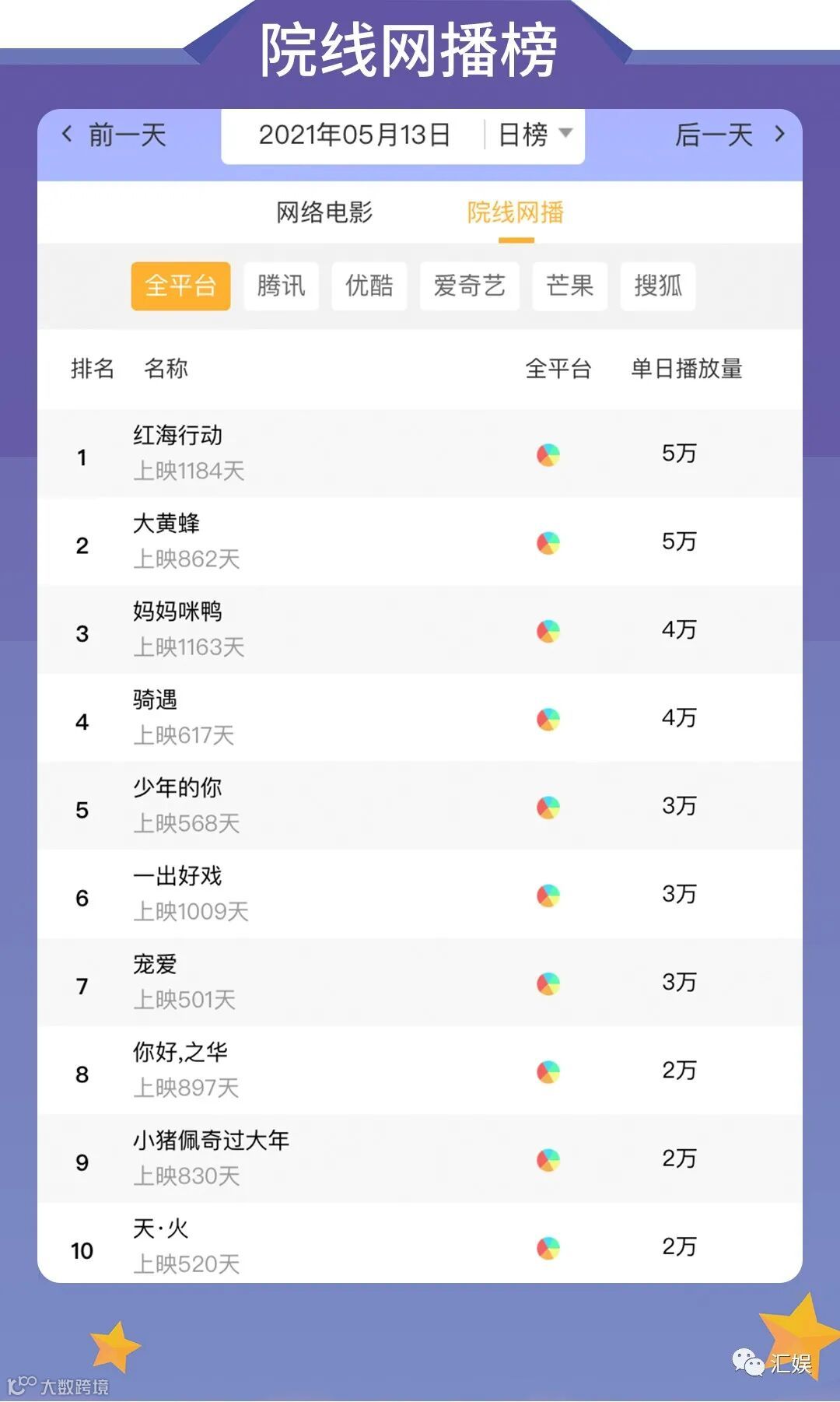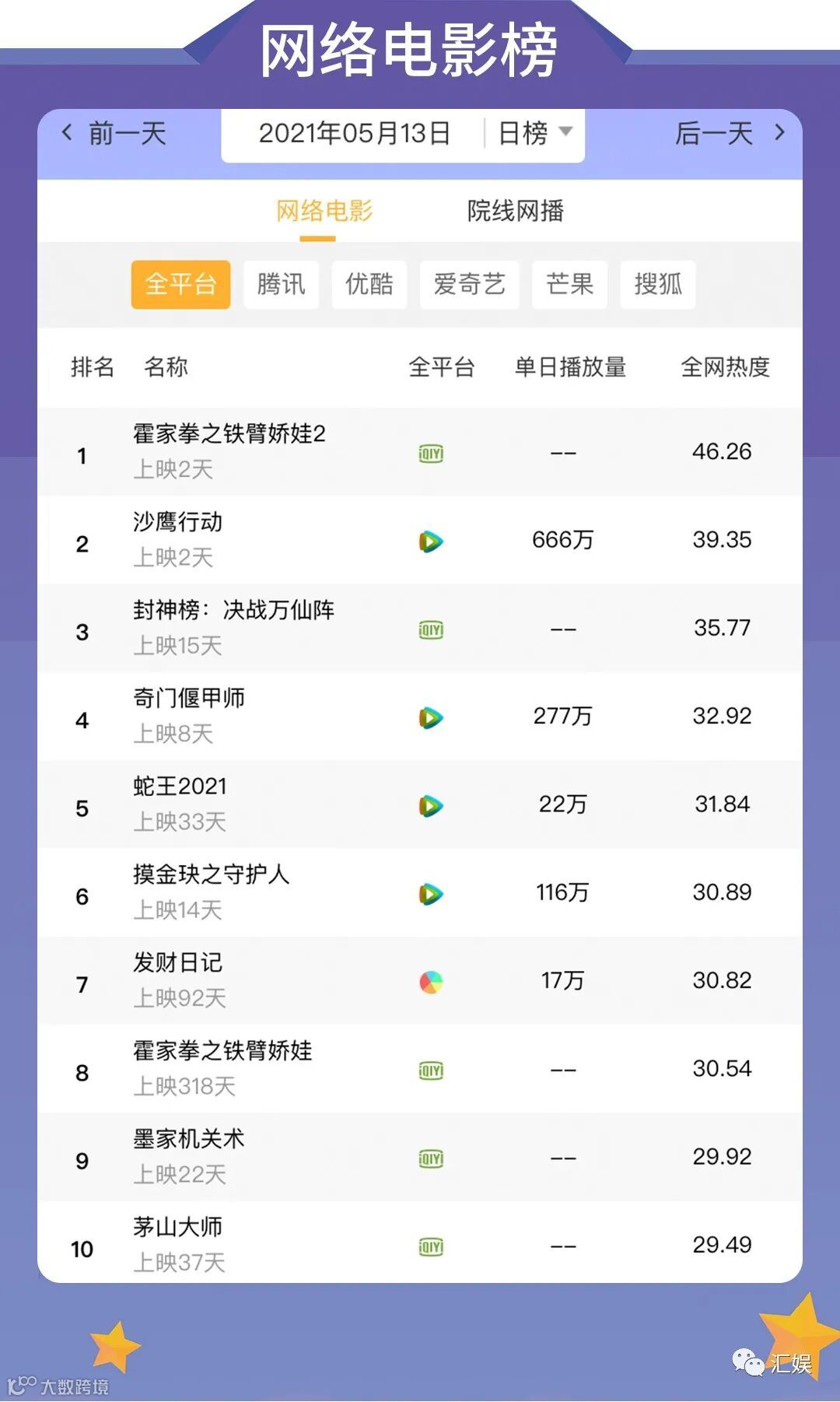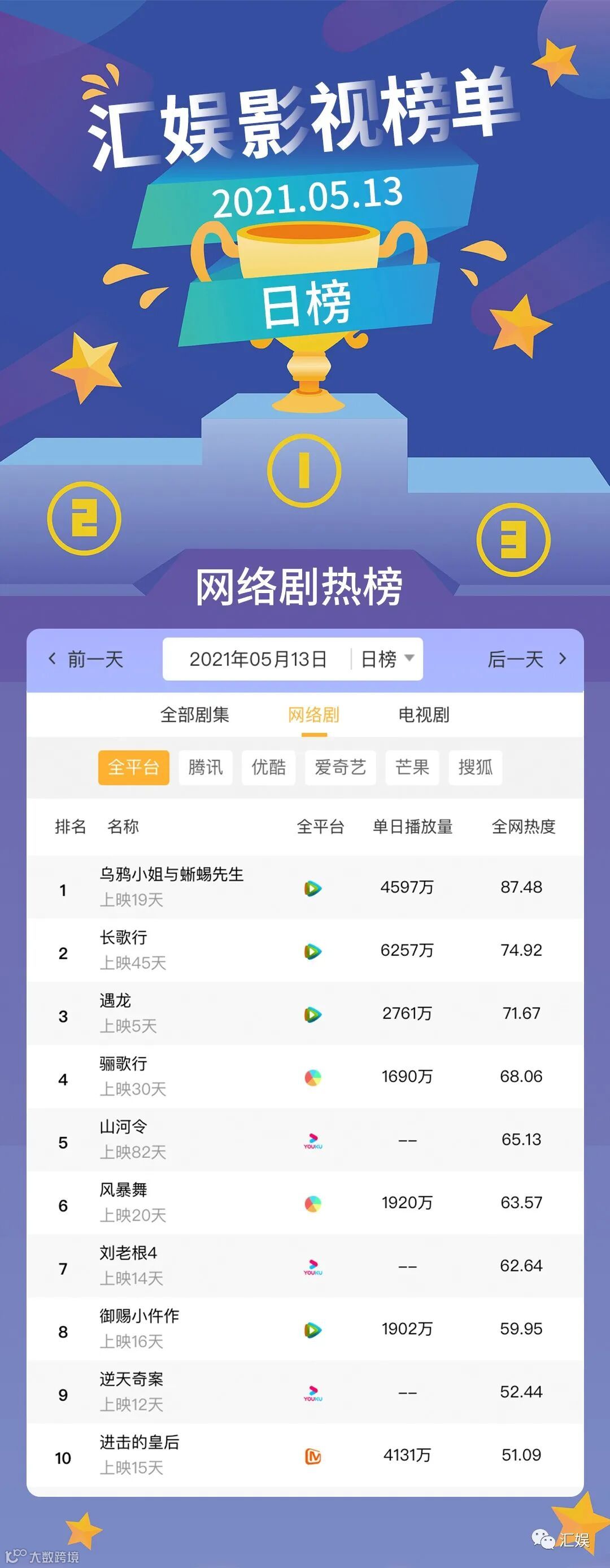 汇娱数据 | 2021.05.13 剧集、综艺、艺人全网平台热度指数