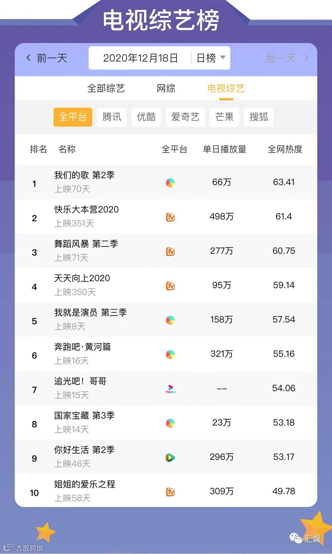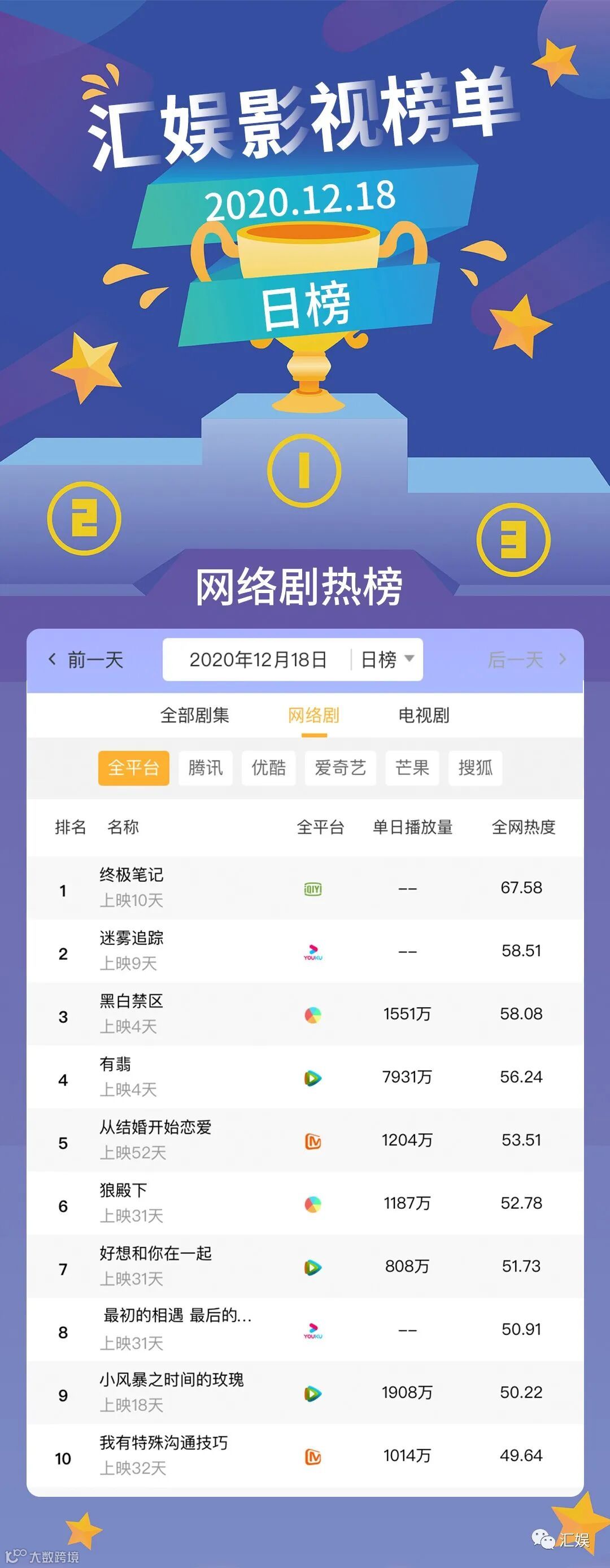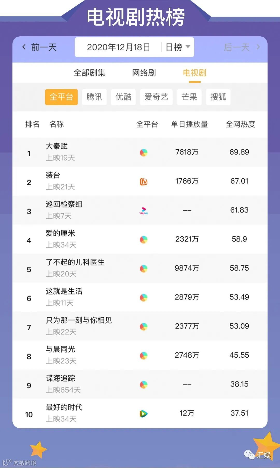 汇娱数据 | 2020.12.18 今日全网热度榜单请查收~