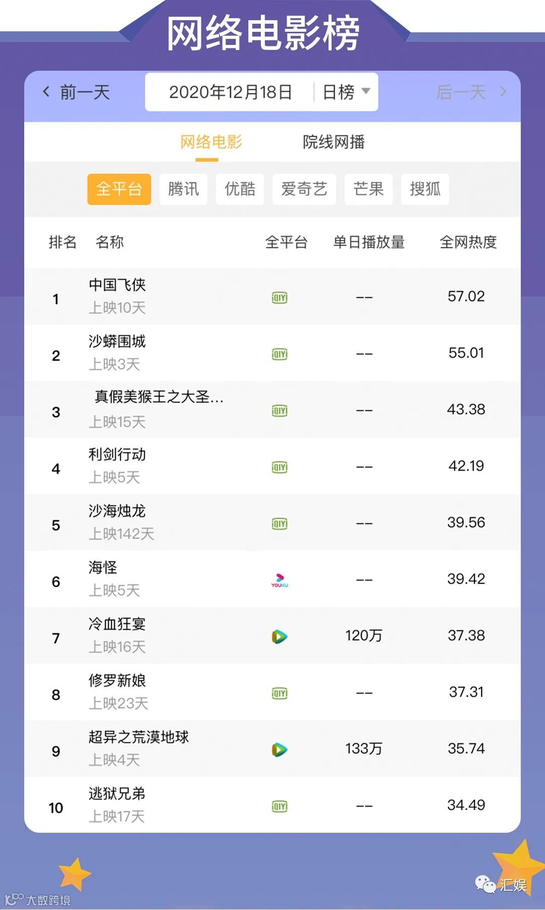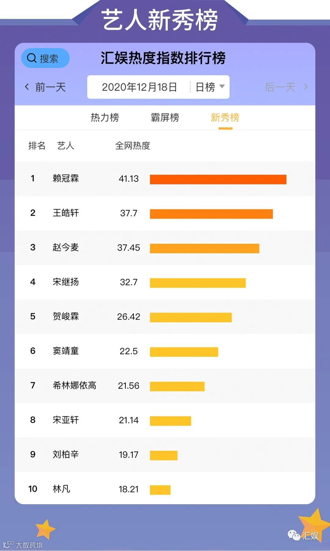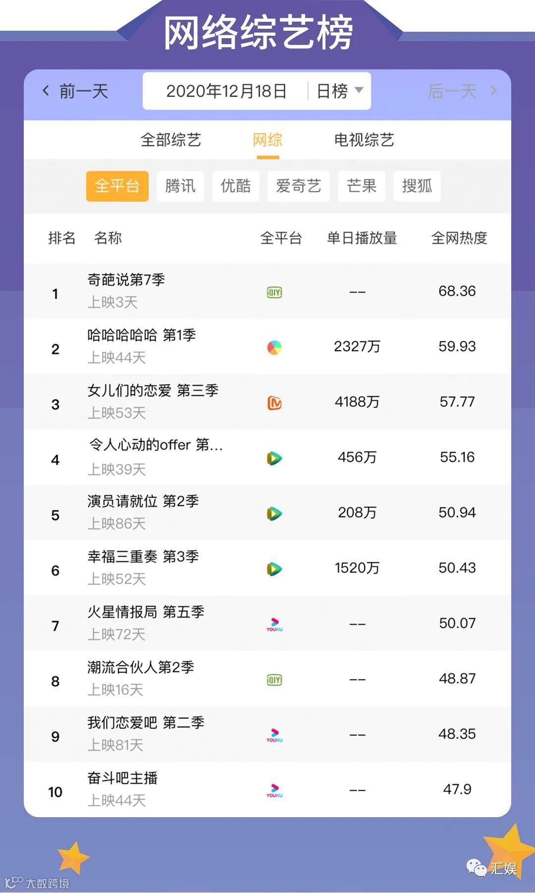 汇娱数据 | 2020.12.18 今日全网热度榜单请查收~