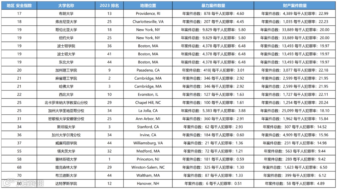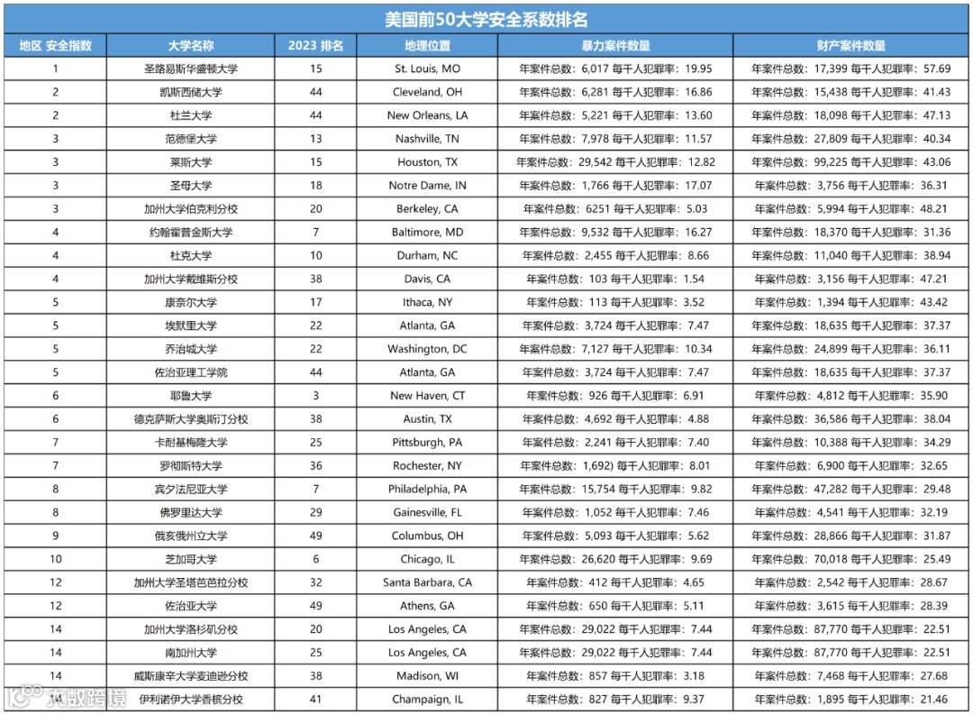 根据 FBI 最新发布的美国犯罪数据和 neighborhoodscout 网站提供的相关信息,并参考了 SafeWise 官网和 U.S.News 官网,我们整理出了2023综排前50美国大学所在地区的安全系数排名,希望对大家选校有所帮助。