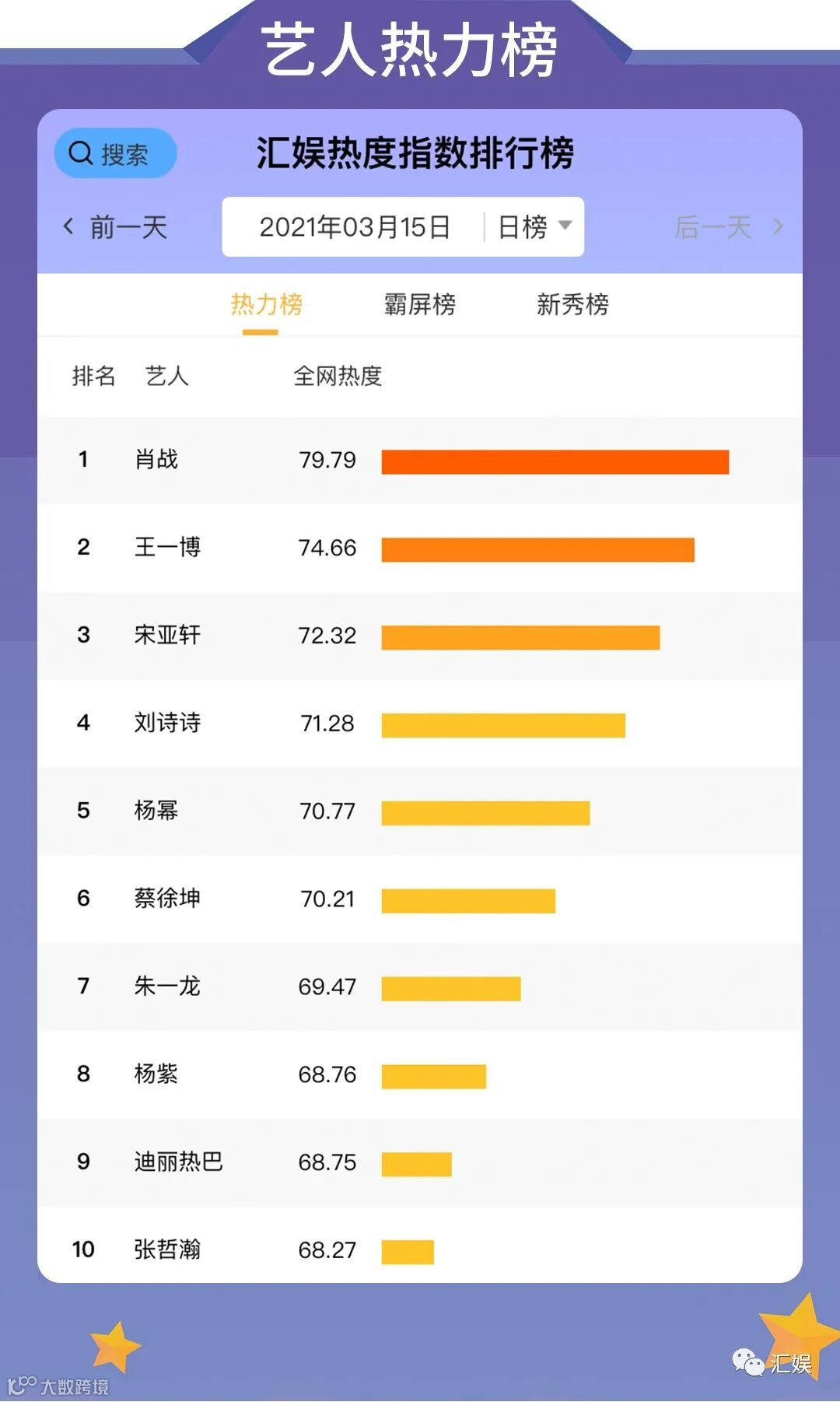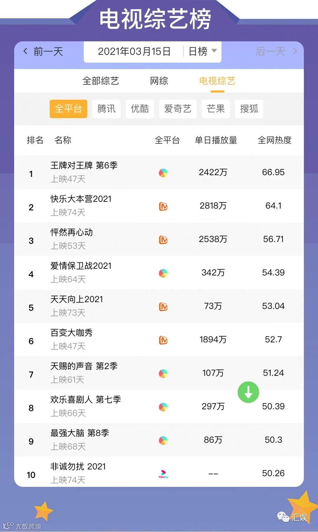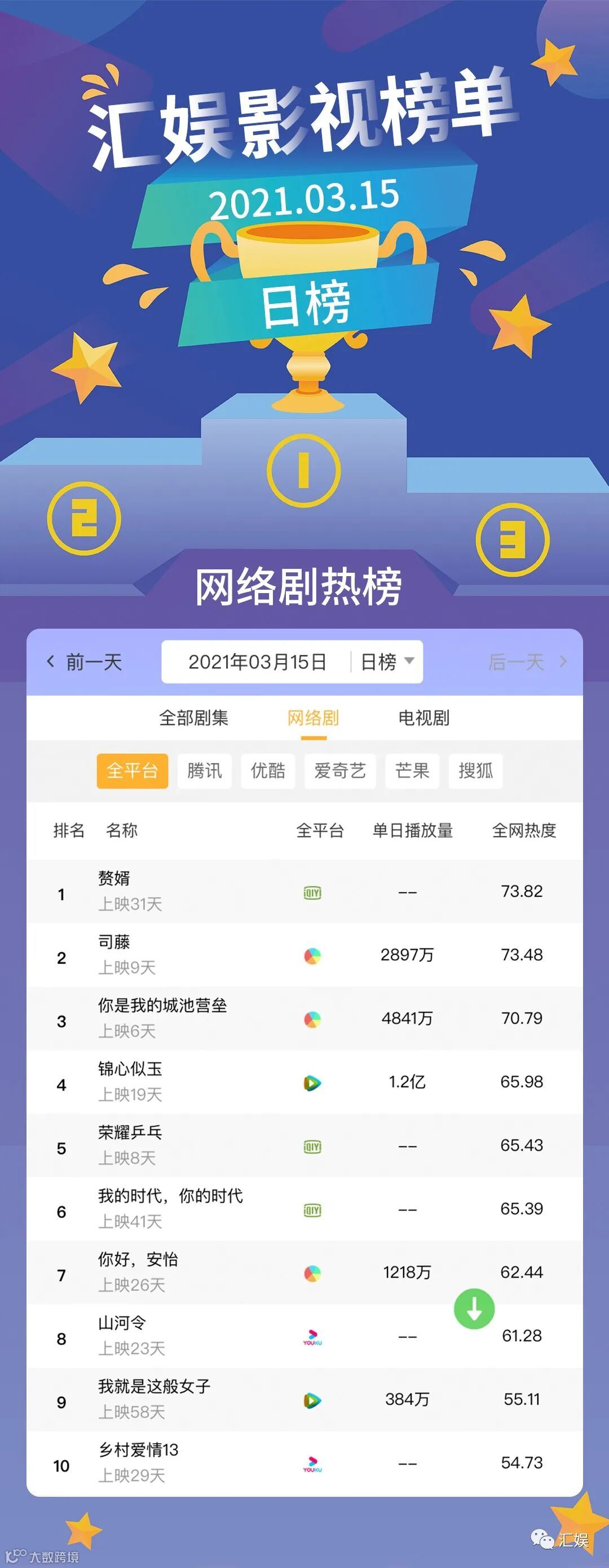 汇娱数据 | 2021.03.15 影视、综艺、艺人全网平台热度指数