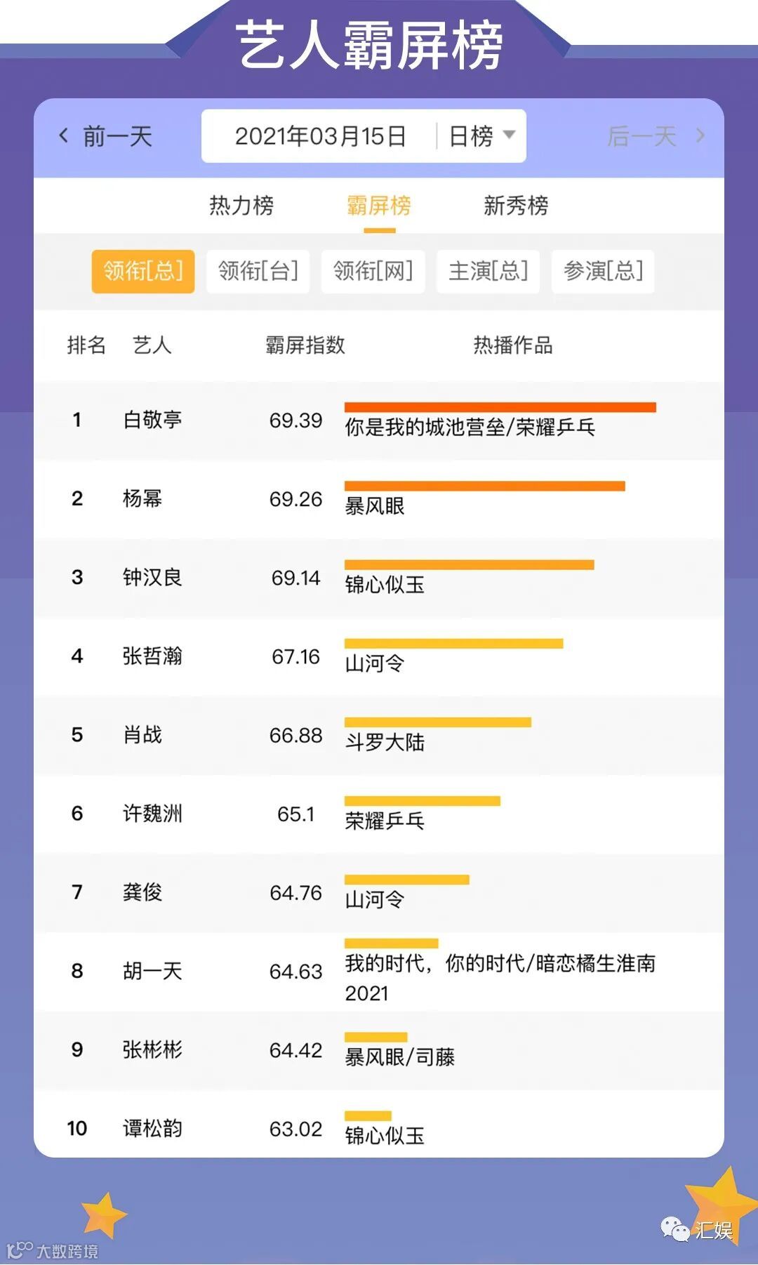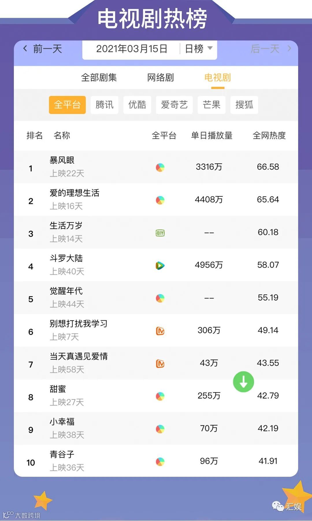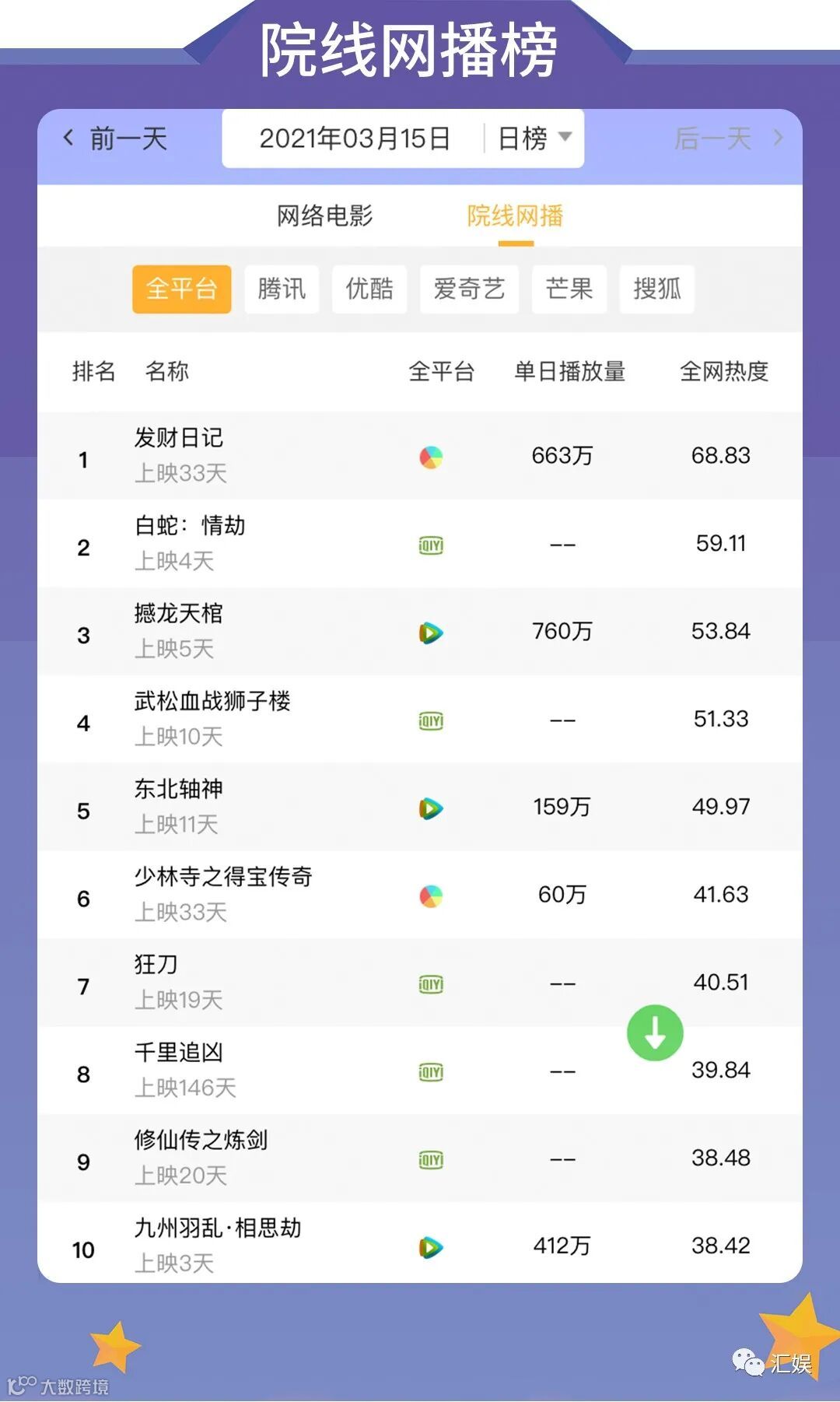 汇娱数据 | 2021.03.15 影视、综艺、艺人全网平台热度指数