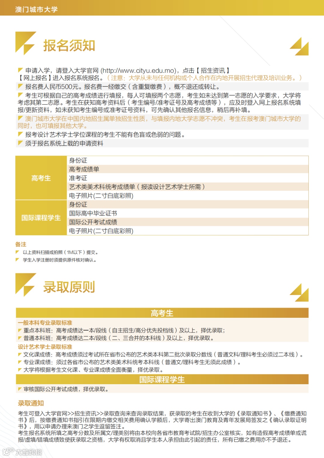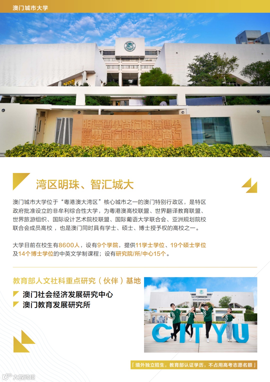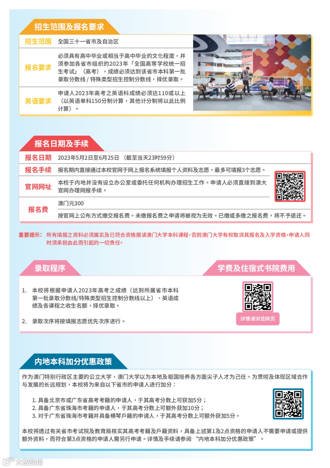 目前,中国澳门共有6所高校面向内地招收本科生,分别是:澳门大学、澳门科技大学、澳门理工大学、澳门城市大学、澳门旅游学院和澳门镜湖护理学院,且颁发的文凭都可以得到教育部的认可。现在各大院校2023年招生简章已公布,一起来看看吧!