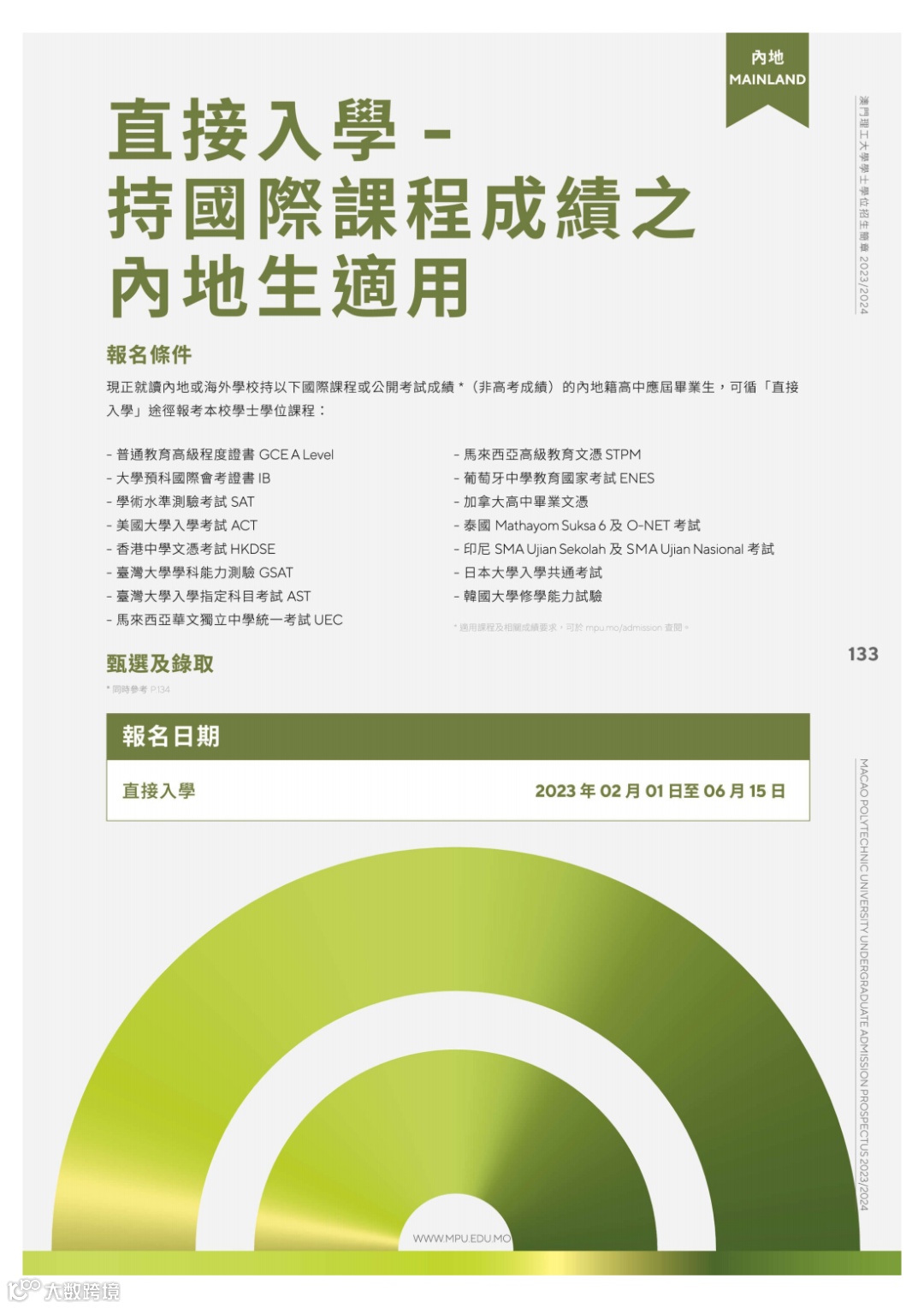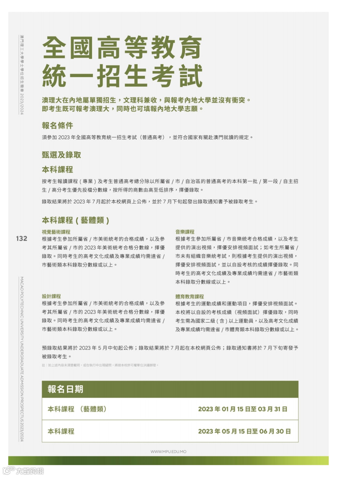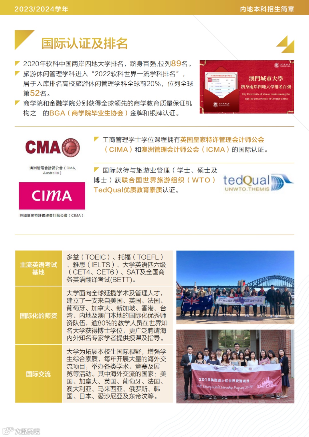 目前,中国澳门共有6所高校面向内地招收本科生,分别是:澳门大学、澳门科技大学、澳门理工大学、澳门城市大学、澳门旅游学院和澳门镜湖护理学院,且颁发的文凭都可以得到教育部的认可。现在各大院校2023年招生简章已公布,一起来看看吧!