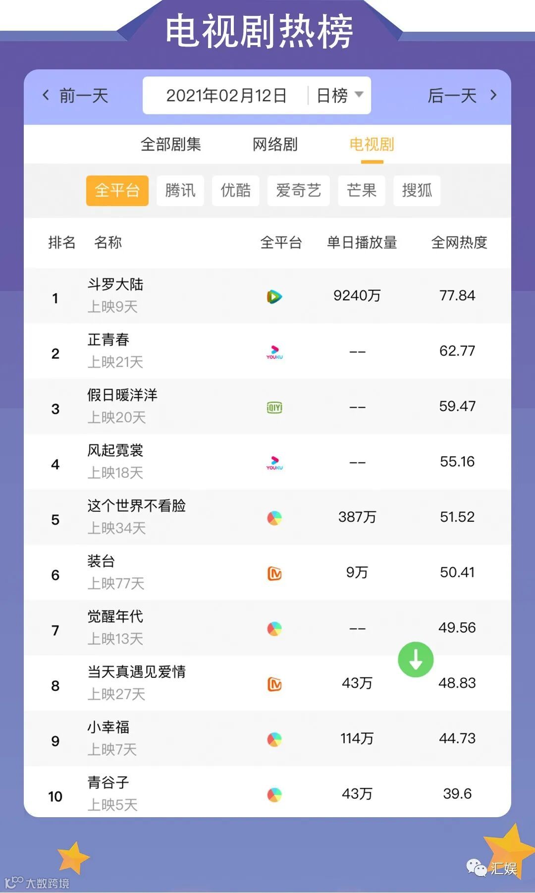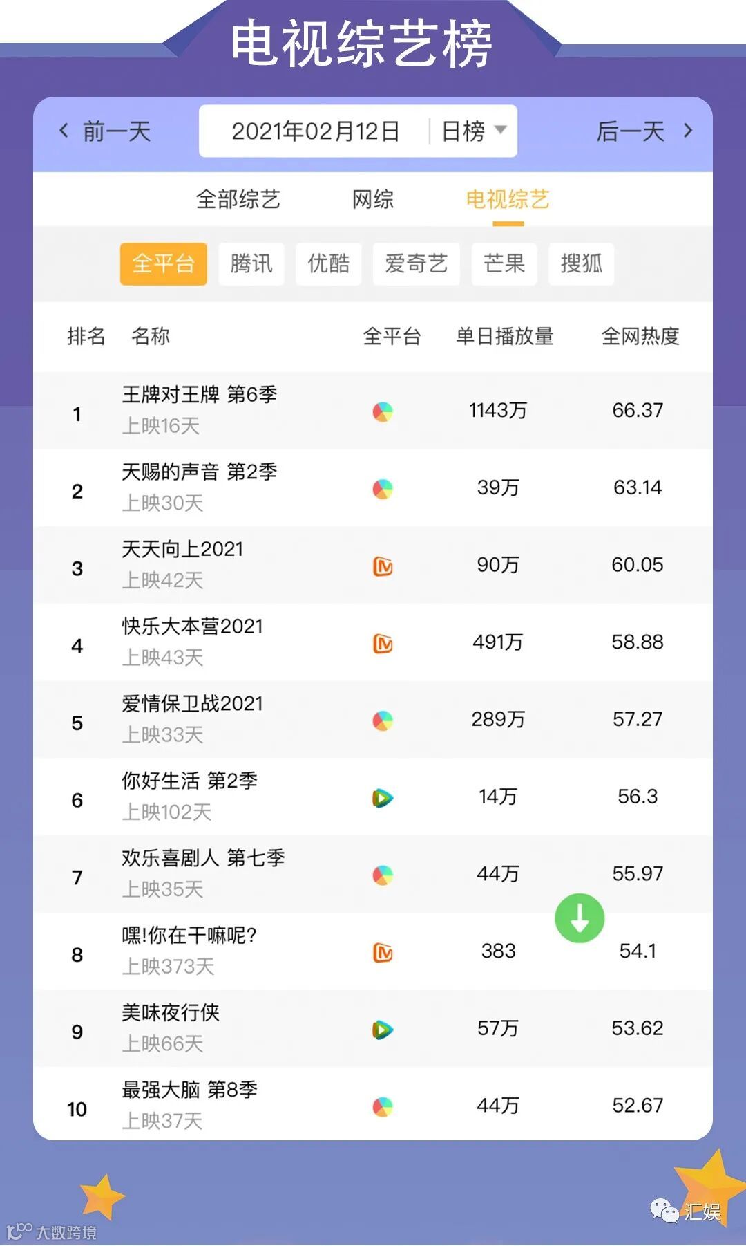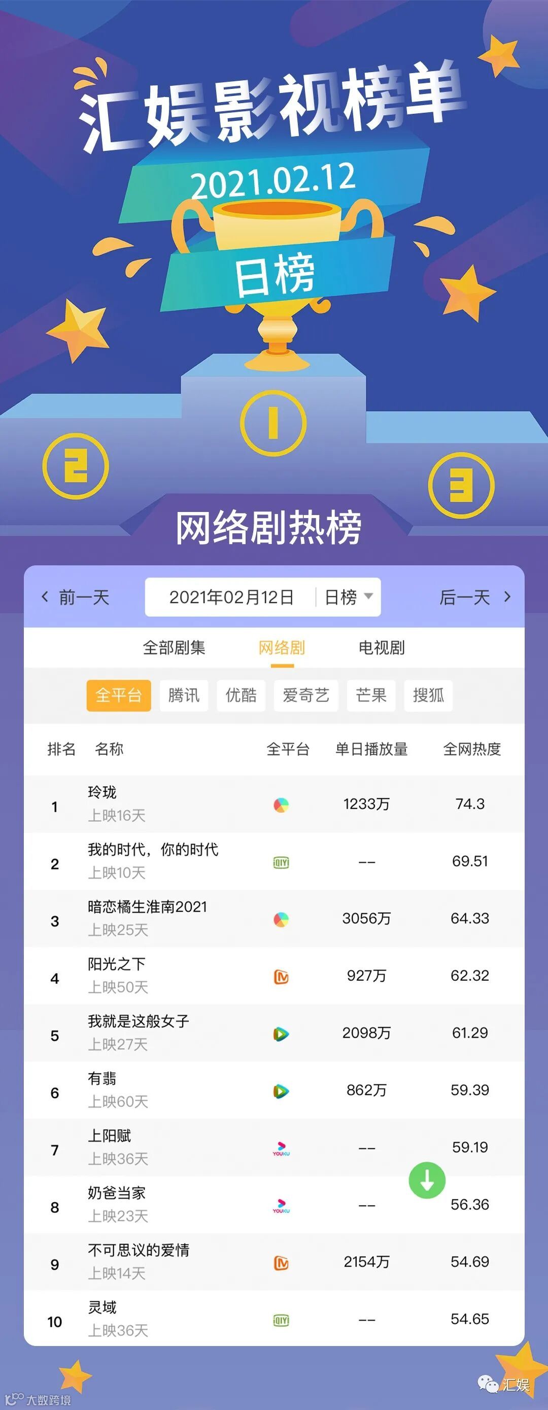 汇娱数据 | 2021.02.12 影视、综艺、艺人全网平台热度指数