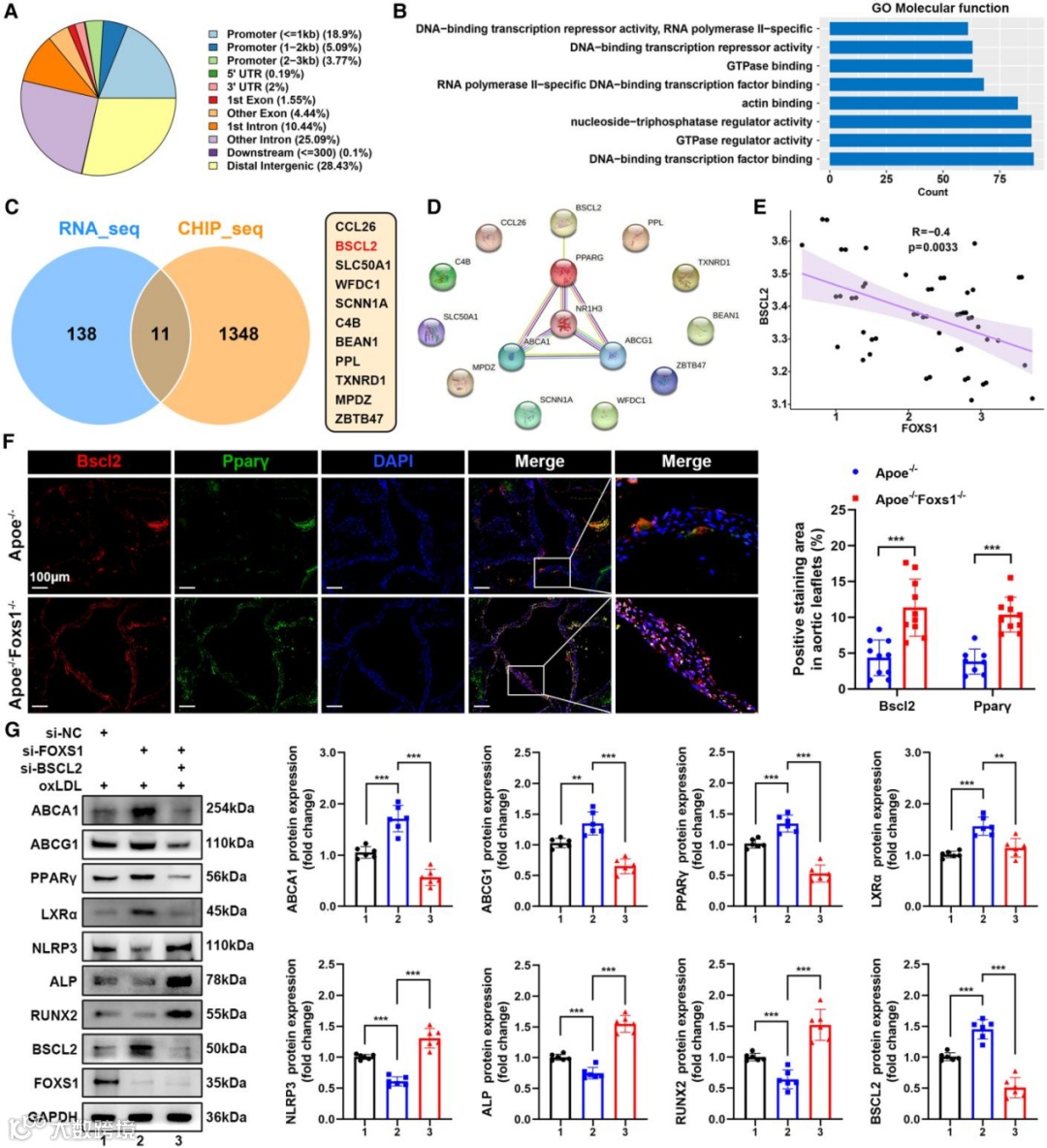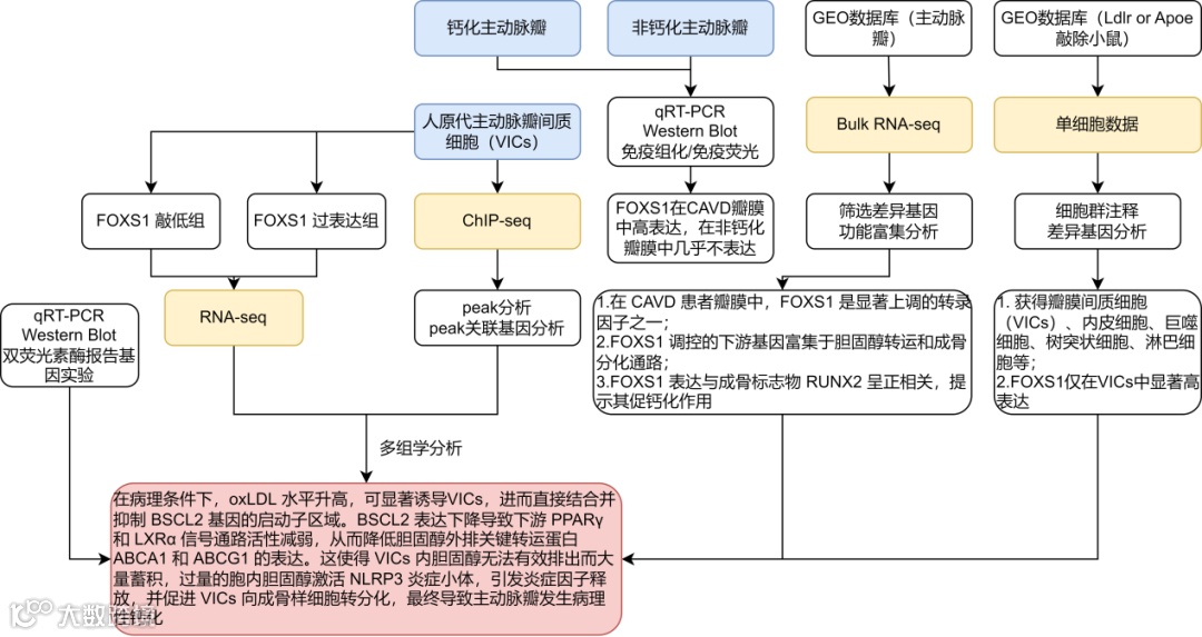 该研究综合运用转录组学(bulk RNA-seq)、单细胞RNA测序(scRNA-seq)和染色质免疫沉淀测序(ChIP-seq)等多组学技术,系统揭示了氧化低密度脂蛋白(oxLDL)通过上调转录因子FOXS1驱动钙化性主动脉瓣疾病(CAVD)的新机制:FOXS1直接结合并抑制BSCL2基因启动子,导致PPARγ–LXRα信号通路下调,进而减少胆固醇转运蛋白ABCA1/ABCG1的表达,引发VICs内胆固醇蓄积;过量胆固醇激活NLRP3炎症小体,促进瓣膜间质细胞向成骨样细胞转化,最终加剧主动脉瓣钙化。该研究不仅阐明了“脂质沉积–炎症–钙化”的级联调控网络,还提出FOXS1/BSCL2轴可作为CAVD潜在的治疗靶点。