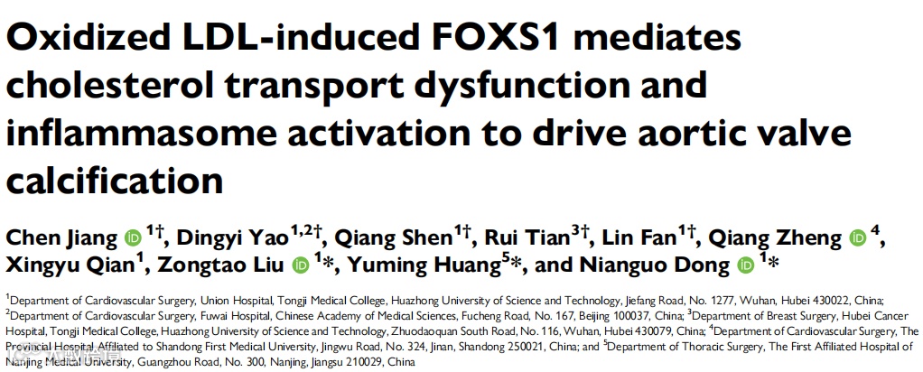 文章题目:Oxidized LDL-induced FOXS1 mediates cholesterol transport dysfunction and inflammasome activation to drive aortic valve calcification
