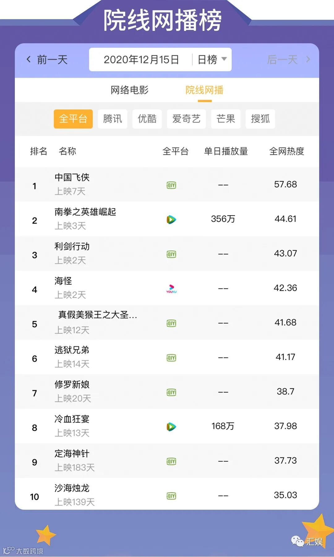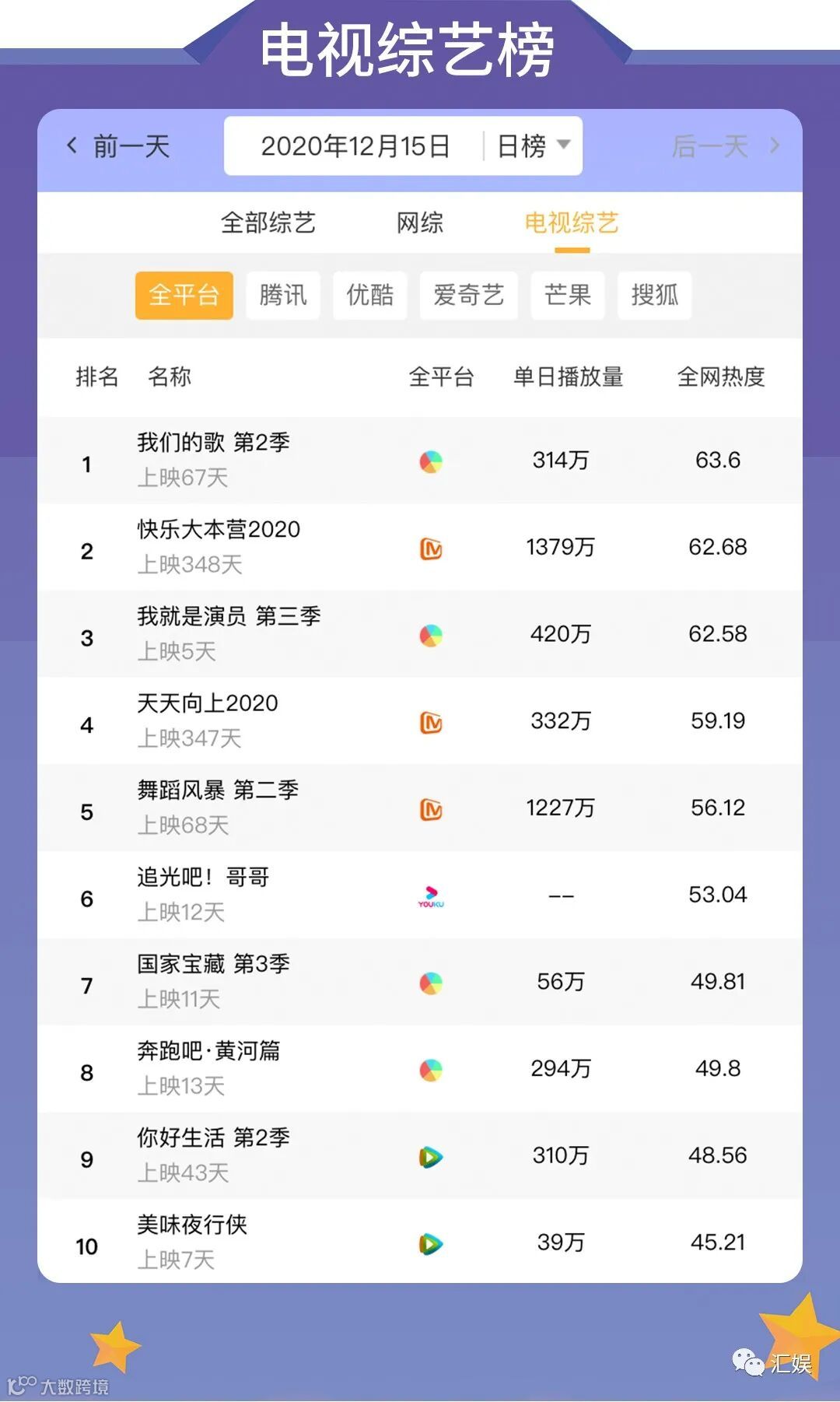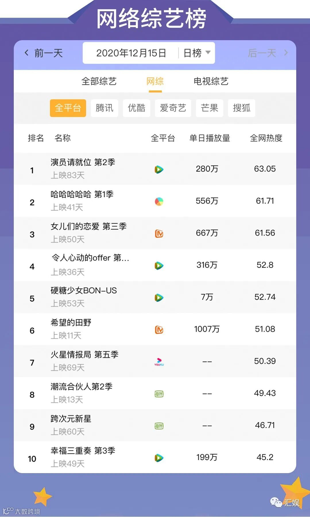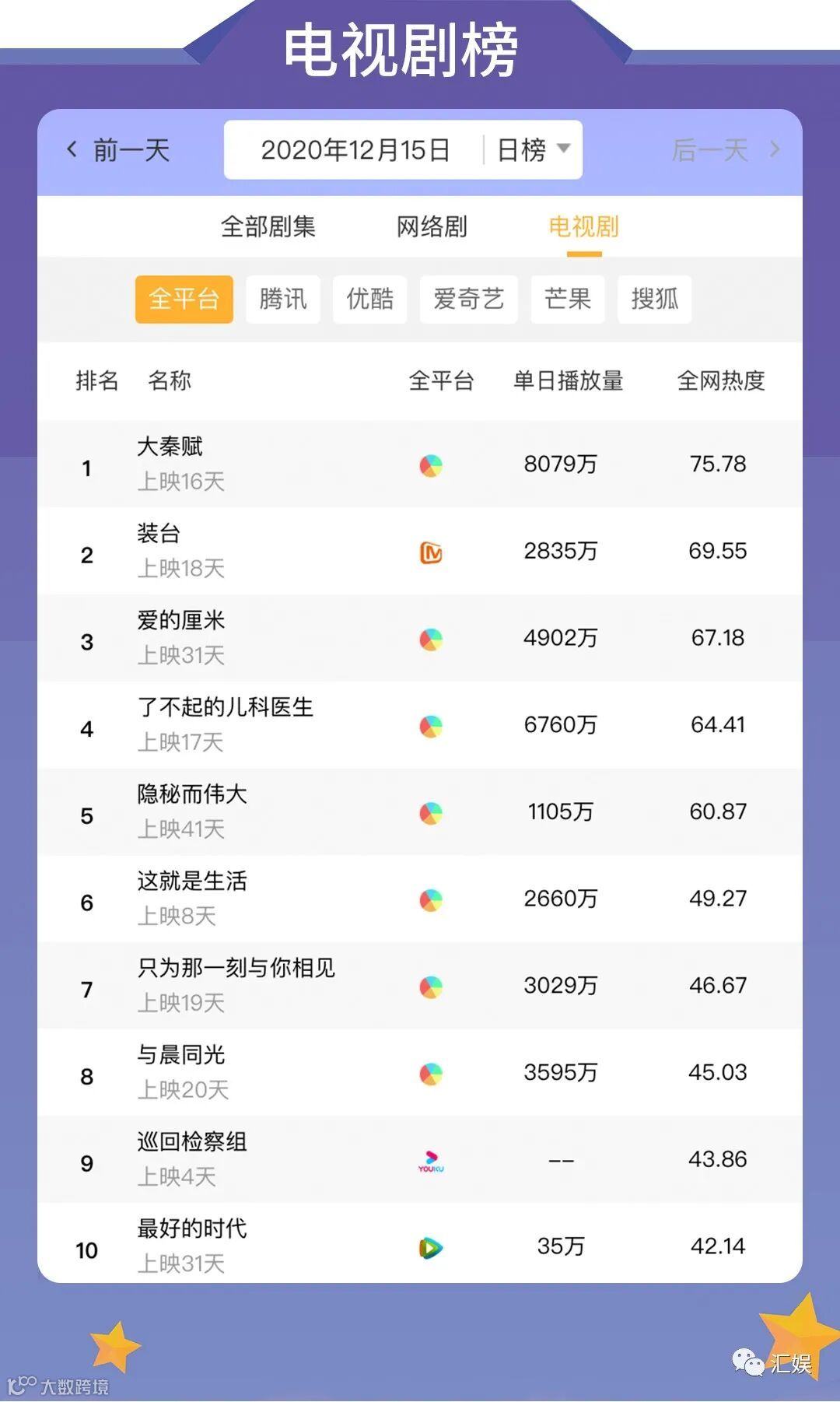 汇娱数据是一个专门针对电视剧、电影、综艺、艺人的第三方数据监测平台。现分为日榜、周榜、月榜对外发布汇娱数据榜单,包括全平台单日播放量、全网热度等一系列数据指数。
