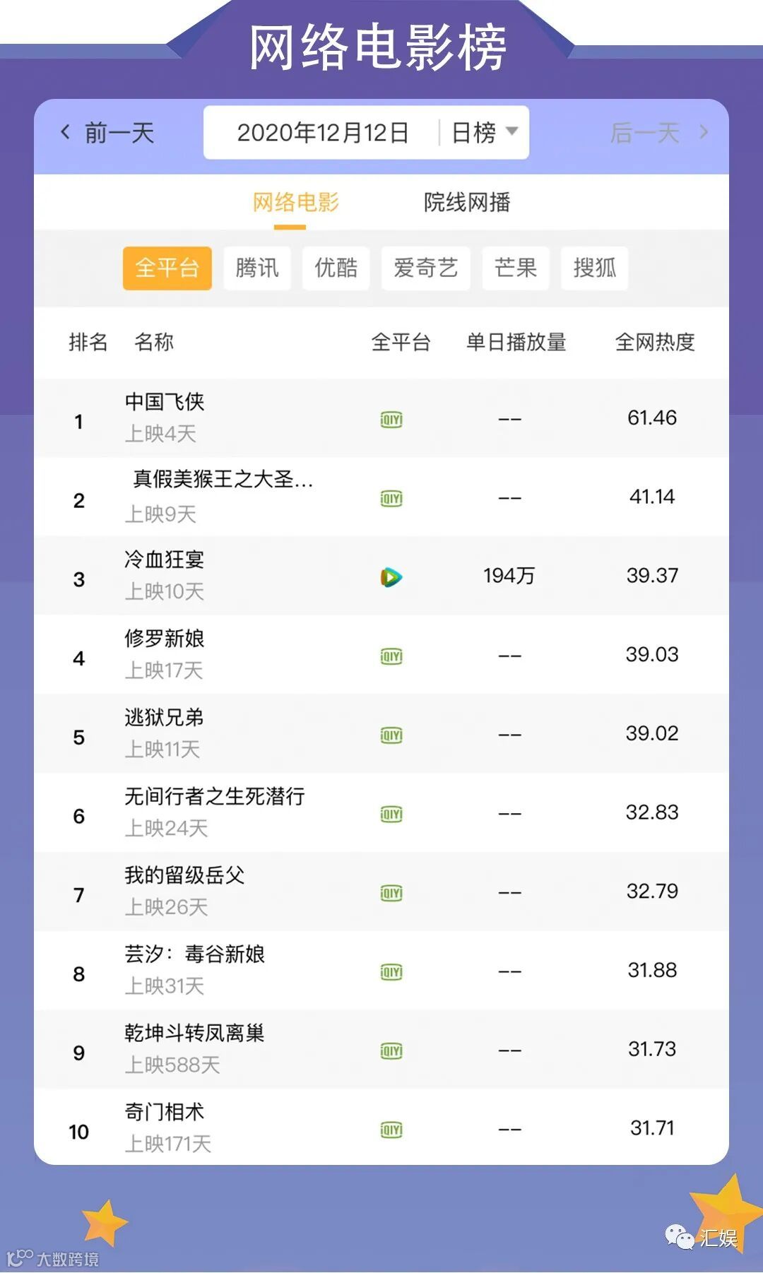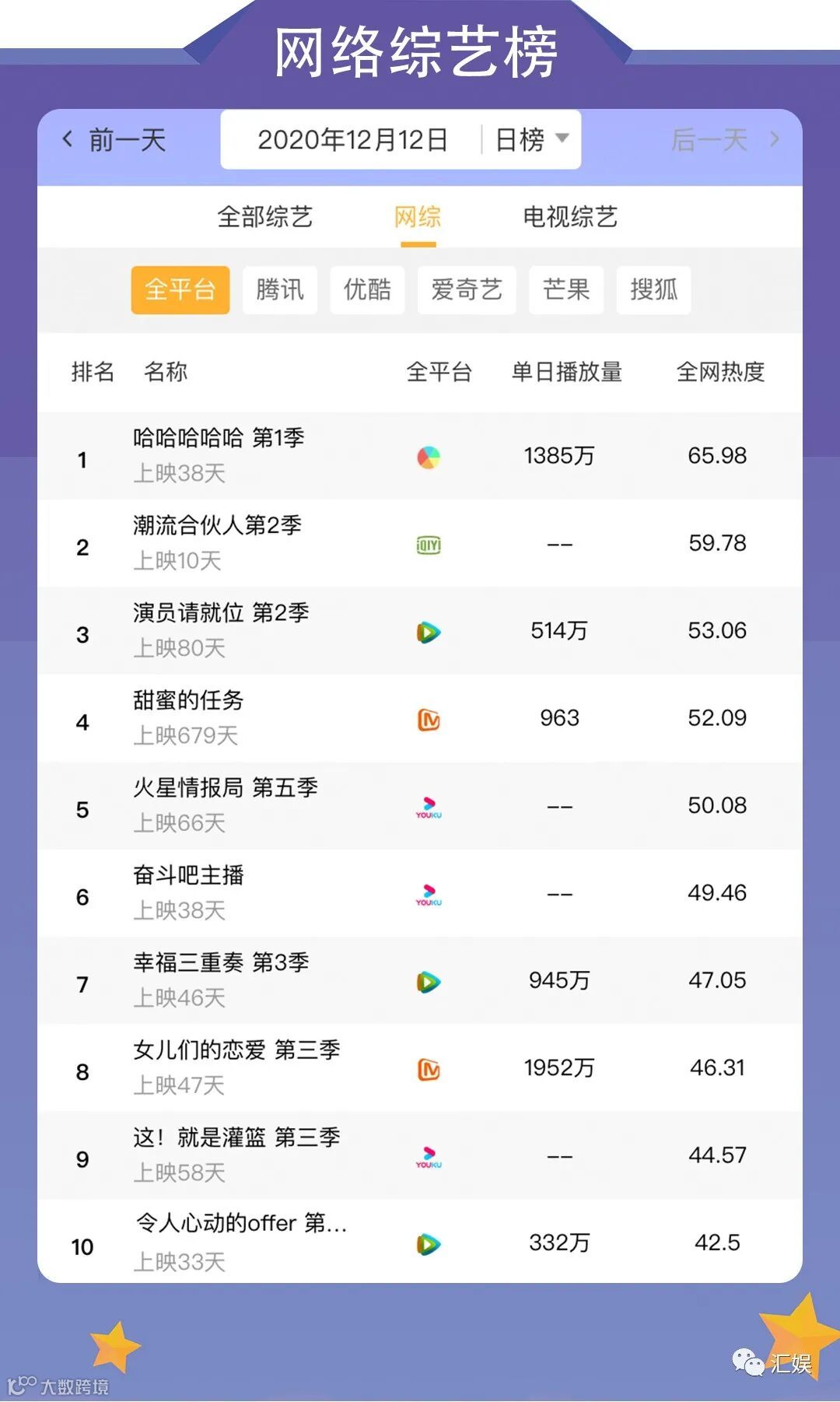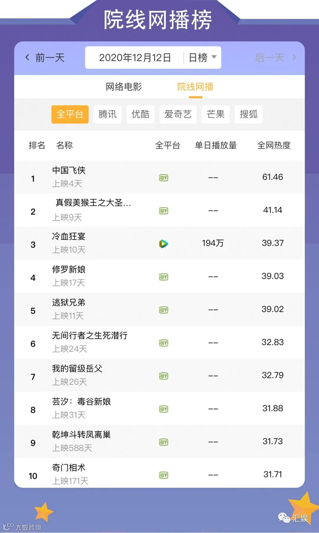 汇娱榜单 | 2020.12.12 今日全网榜单准时送上