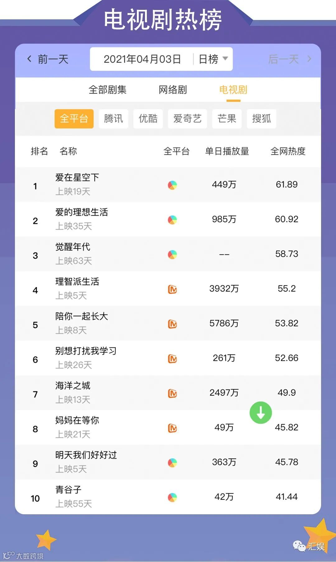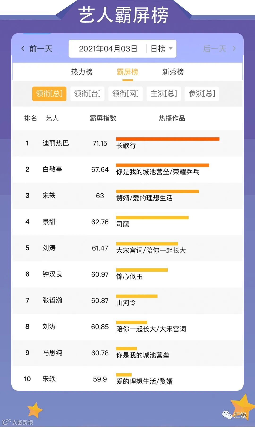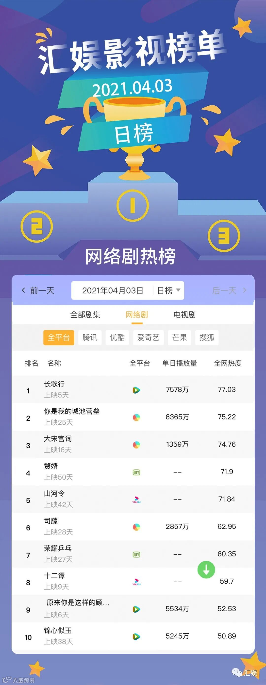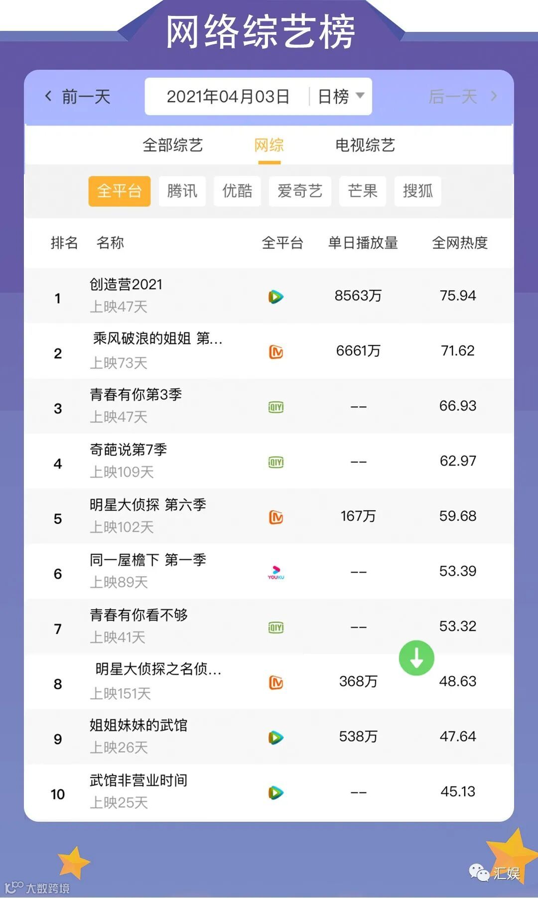 汇娱数据 | 2021.04.03 剧集、综艺、艺人全网平台热度指数