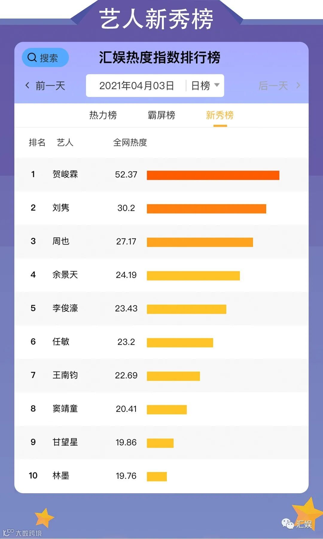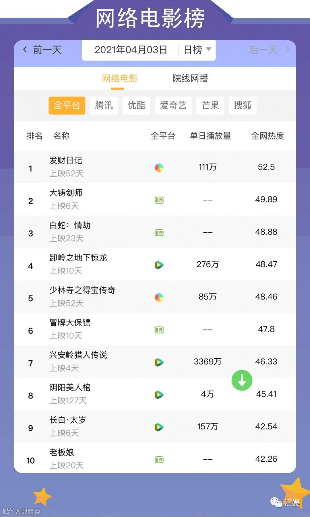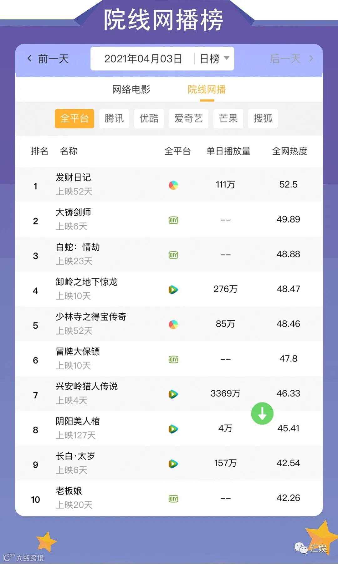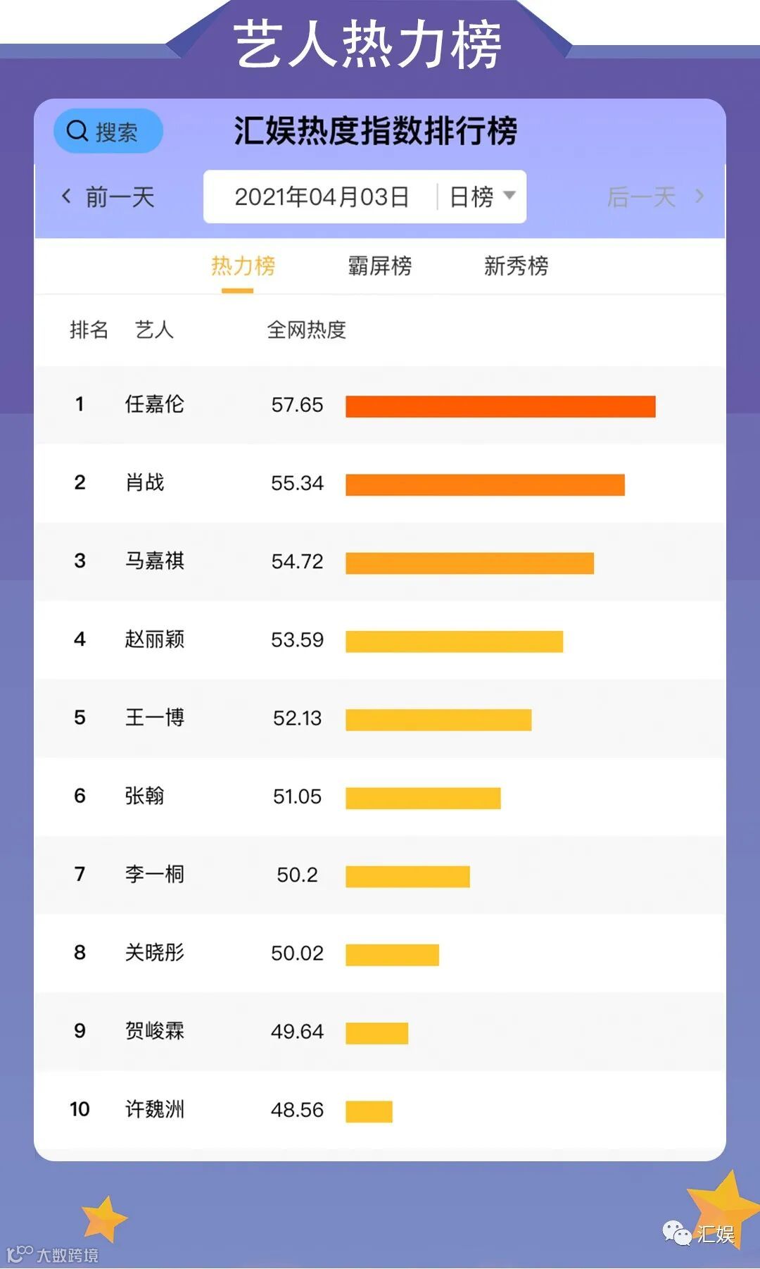 汇娱数据 | 2021.04.03 剧集、综艺、艺人全网平台热度指数