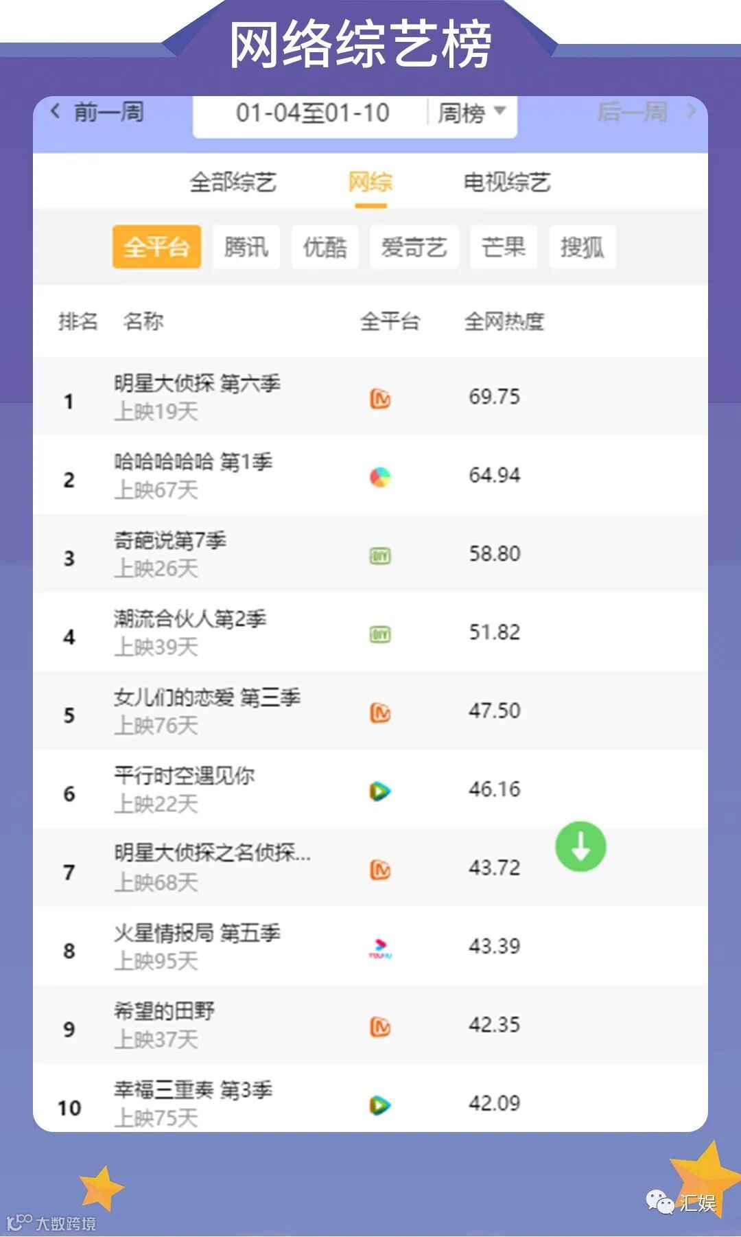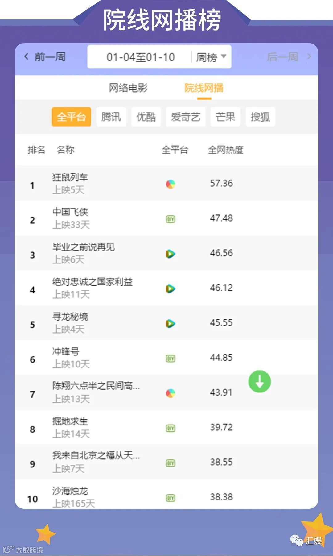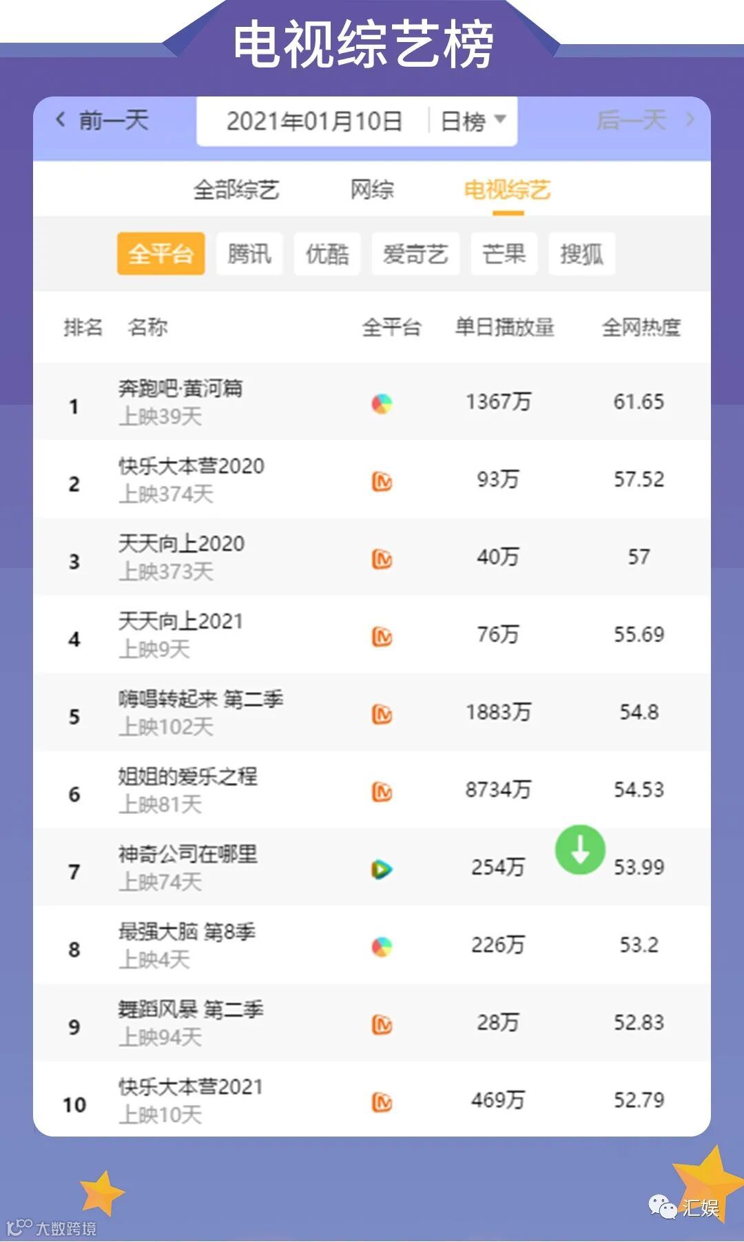 汇娱榜单 | 2021.01.04-01.10 一周全网热度榜单