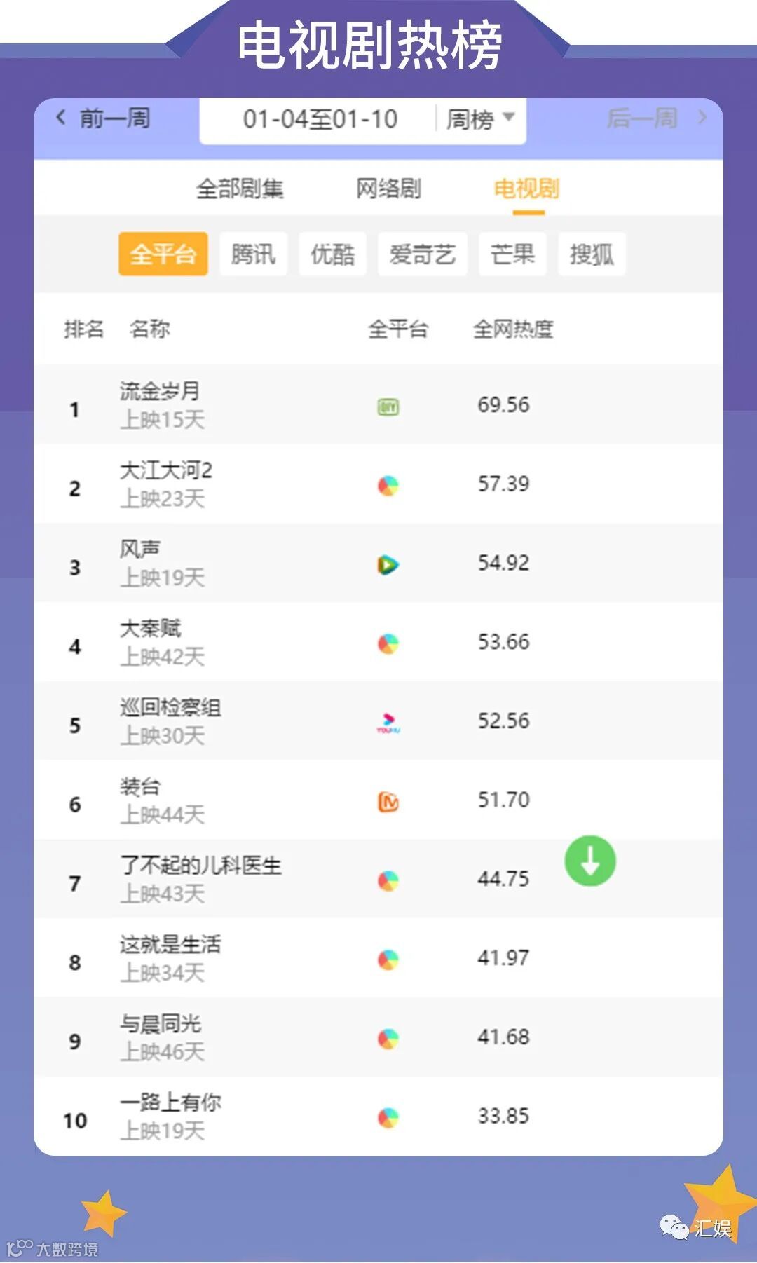 导读:汇娱数据是一个专门针对电视剧、电影、综艺、艺人的第三方数据监测平台。现分为日榜、周榜、月榜对外发