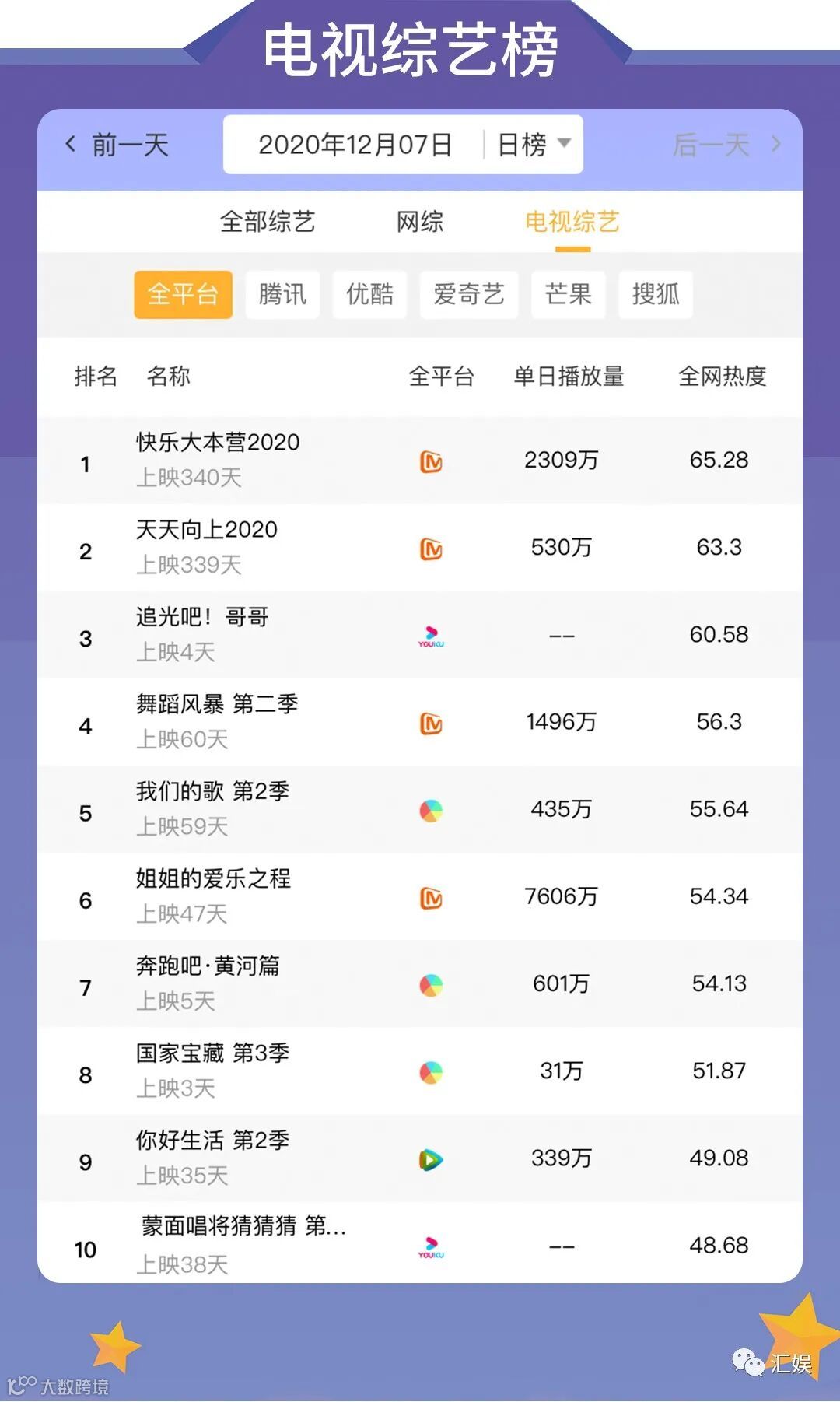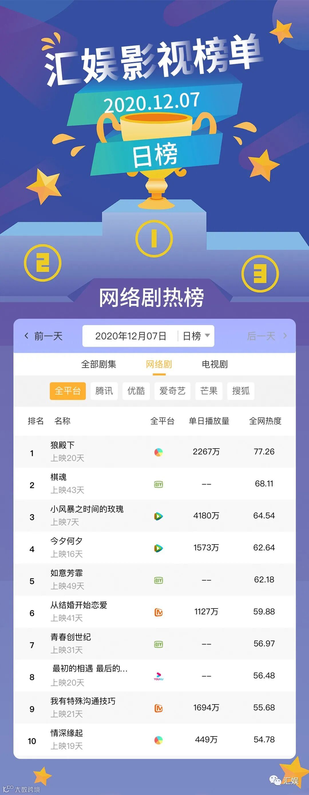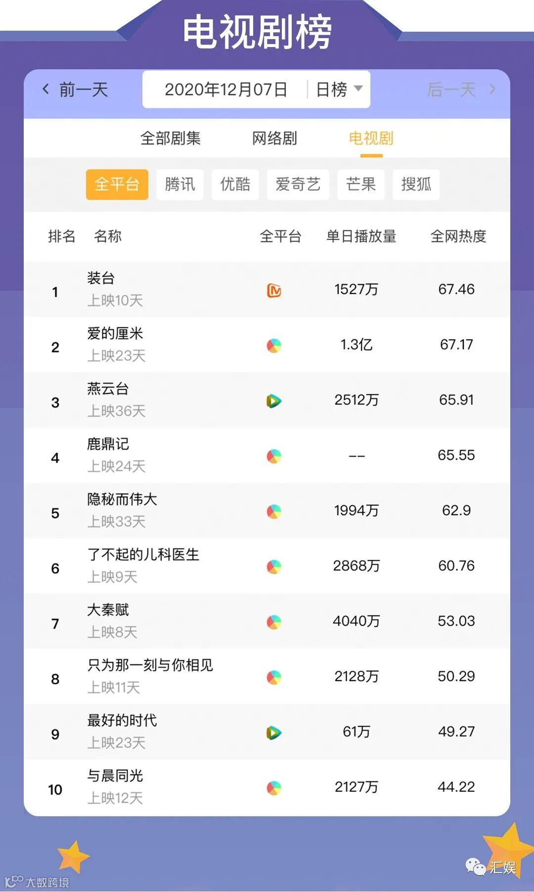 汇娱榜单 | 2020.12.07 影视、综艺、艺人全网平台热度指数