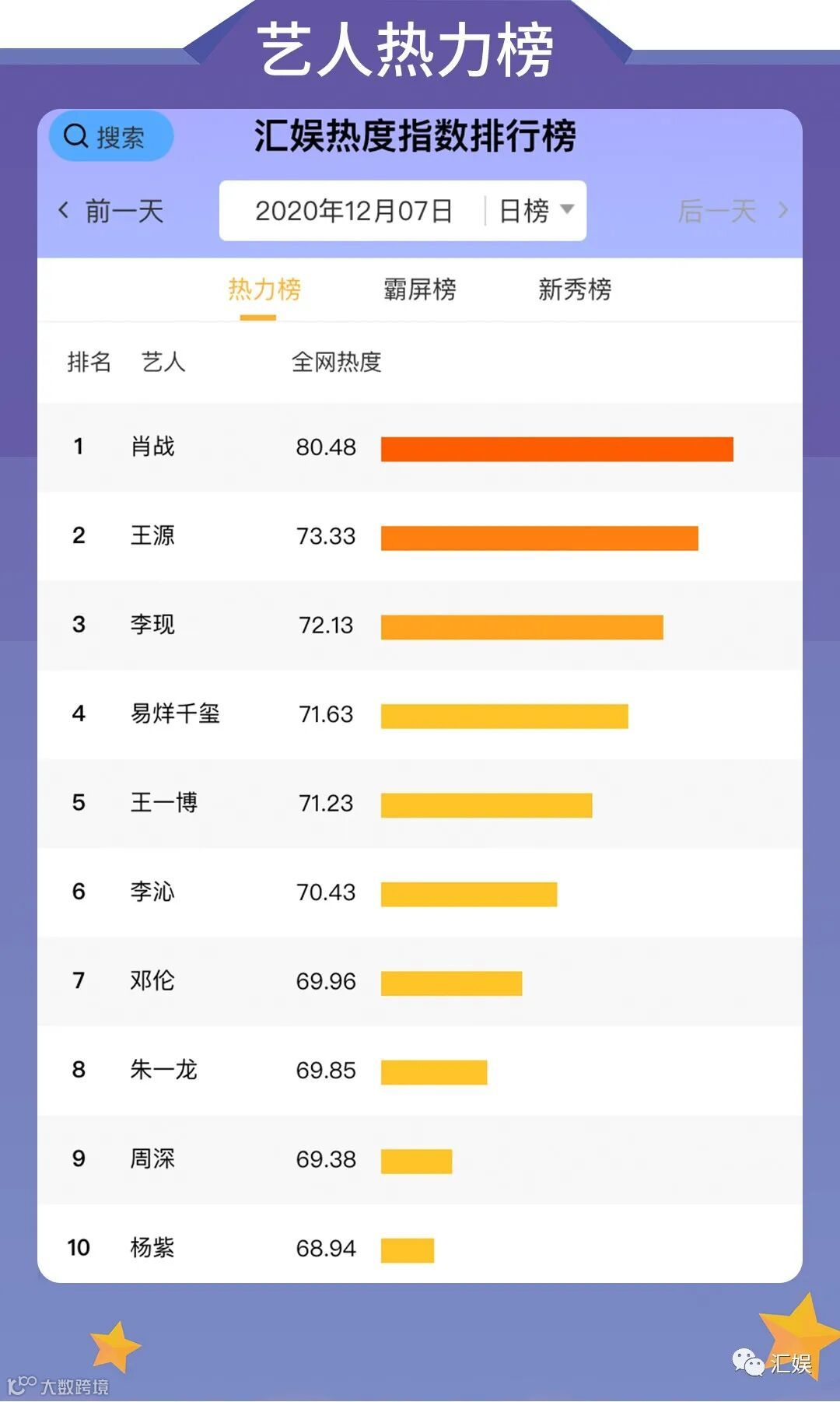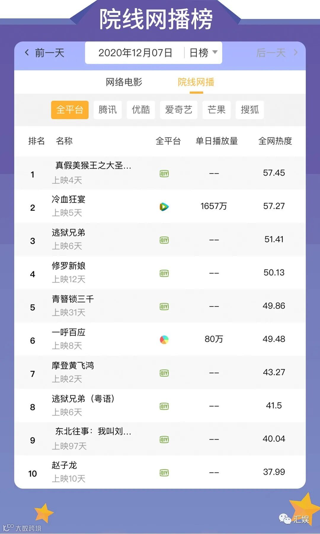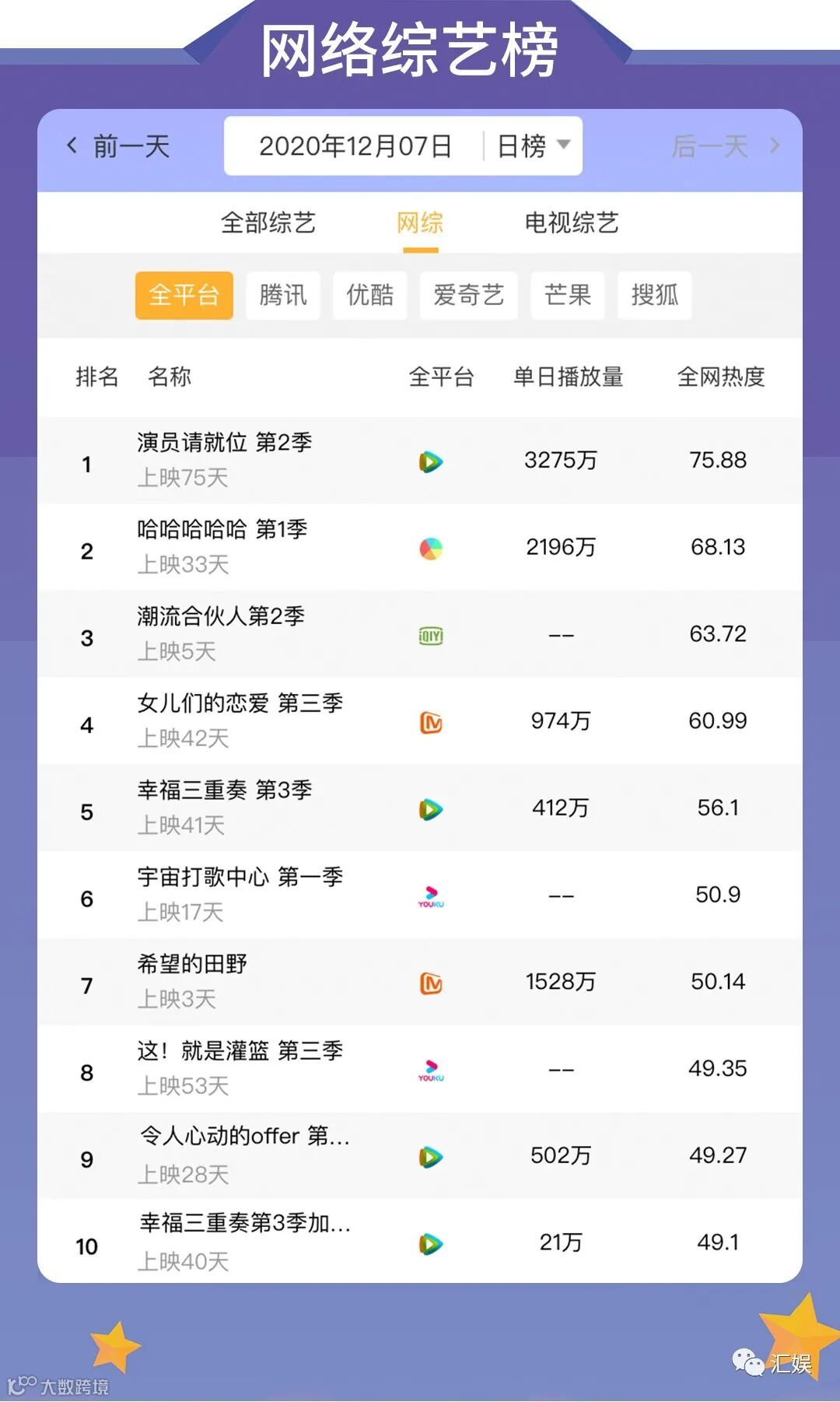 汇娱榜单 | 2020.12.07 影视、综艺、艺人全网平台热度指数