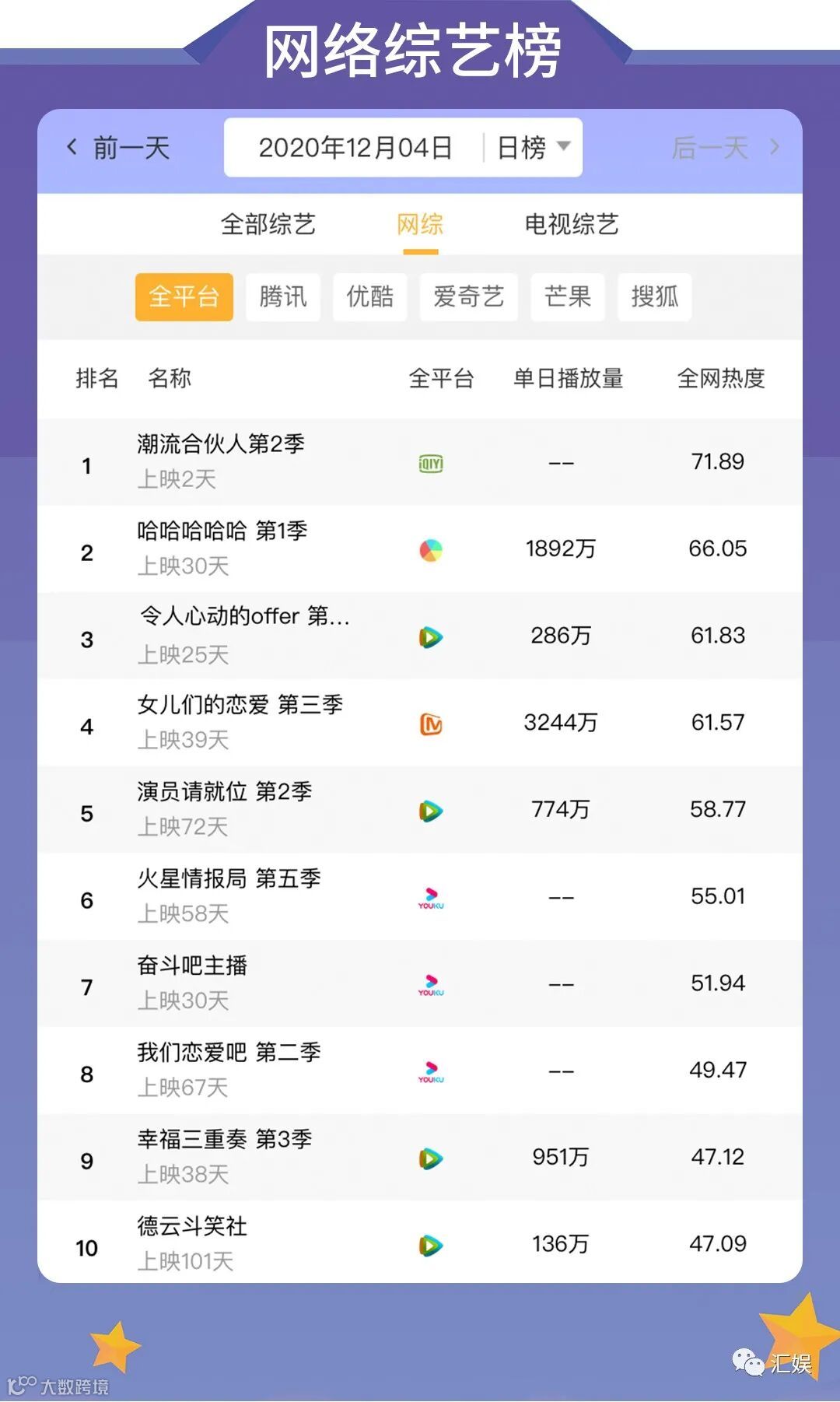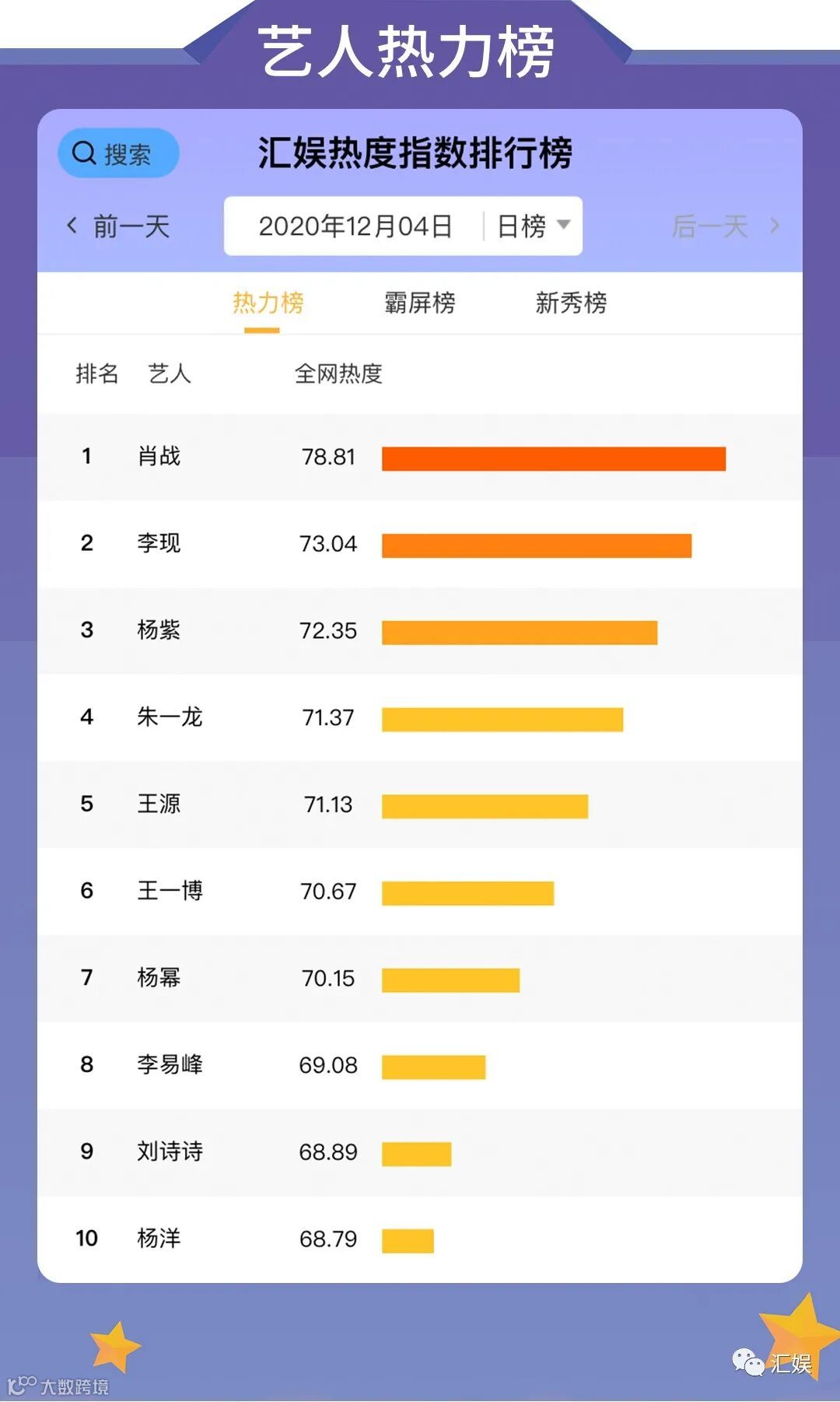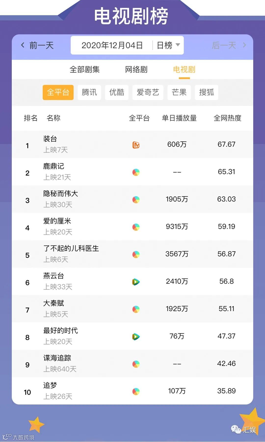 汇娱榜单 | 2020.12.04 影视、综艺、艺人热度指数