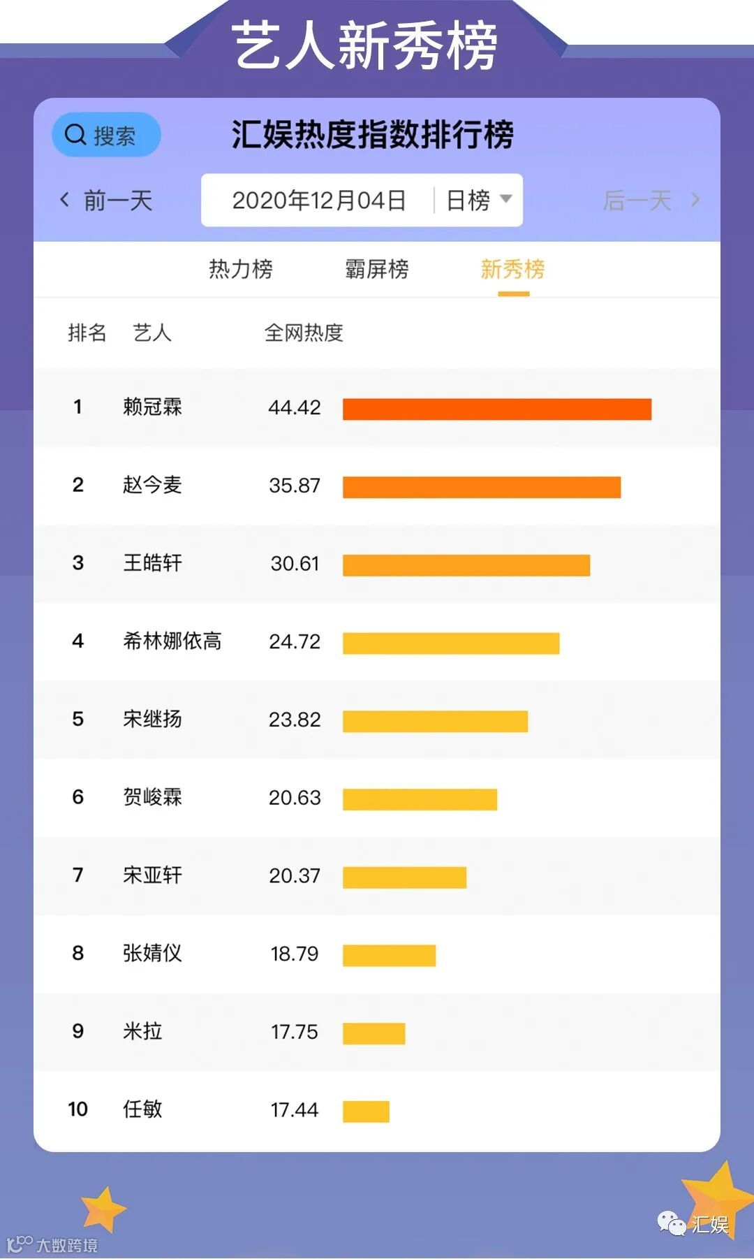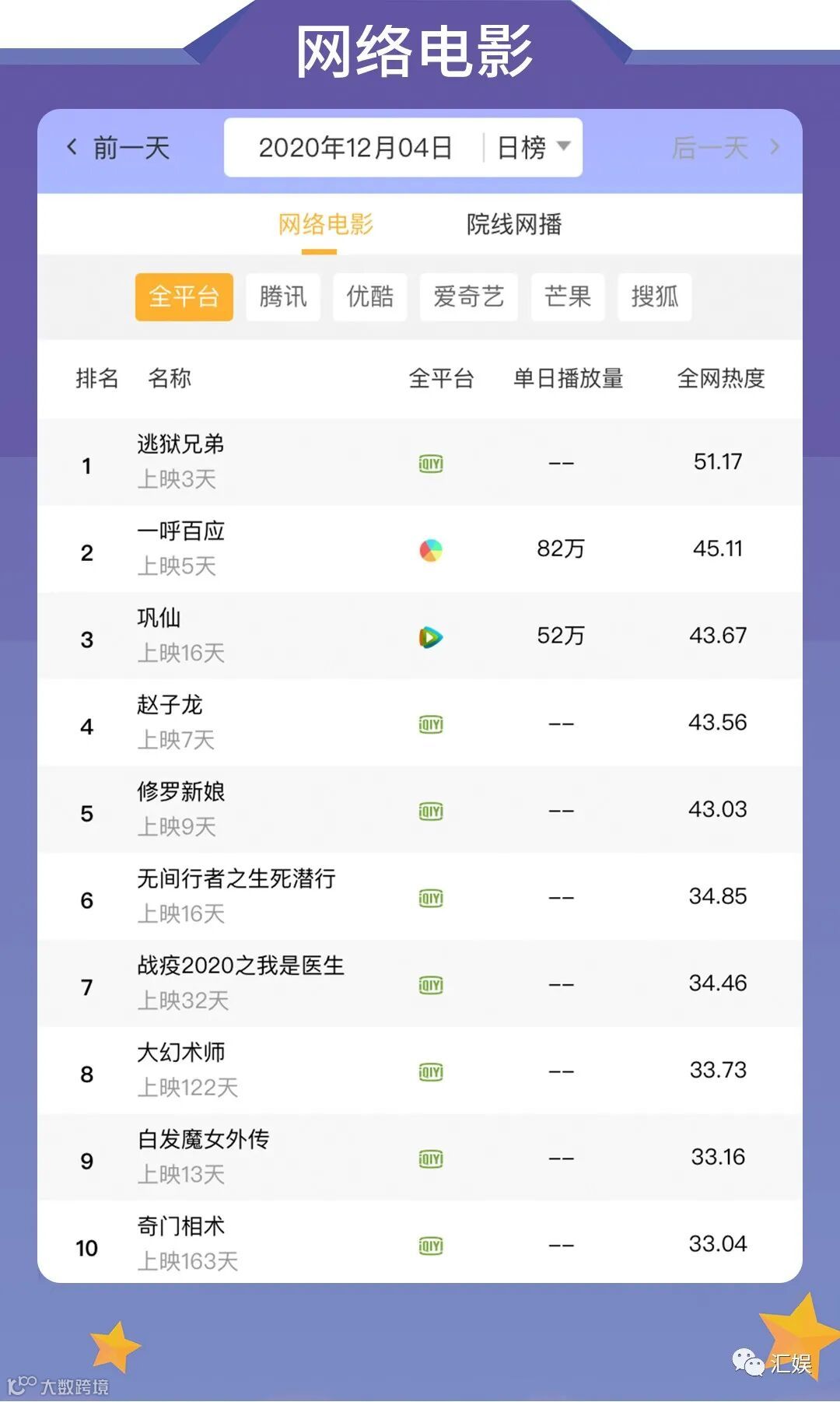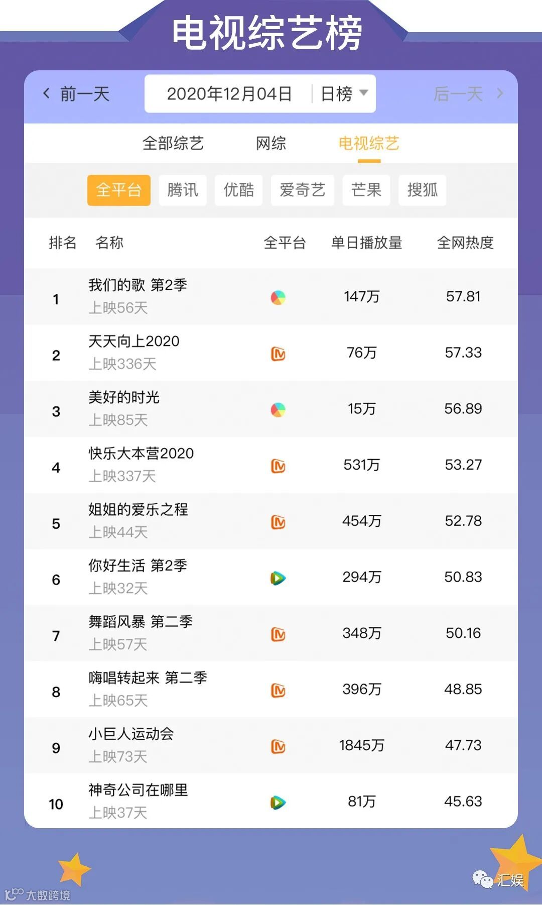 汇娱榜单 | 2020.12.04 影视、综艺、艺人热度指数