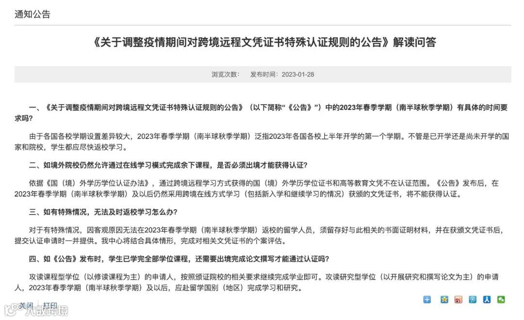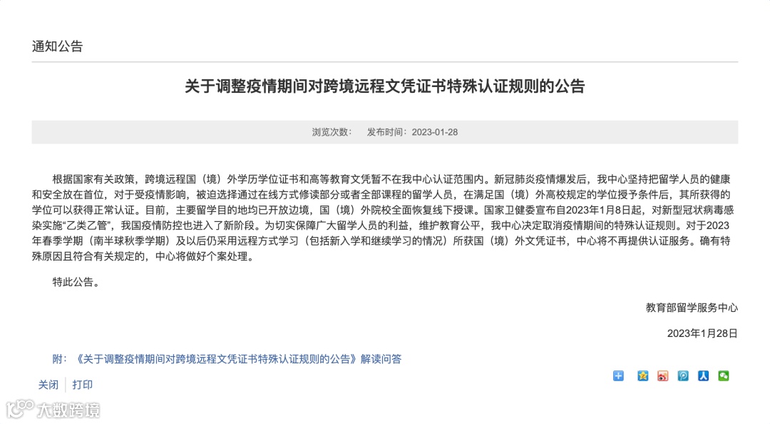 1月28日教育部留学中心发布《关于调整疫情期间对跨境远程文凭证书特殊认证规则的公告》。