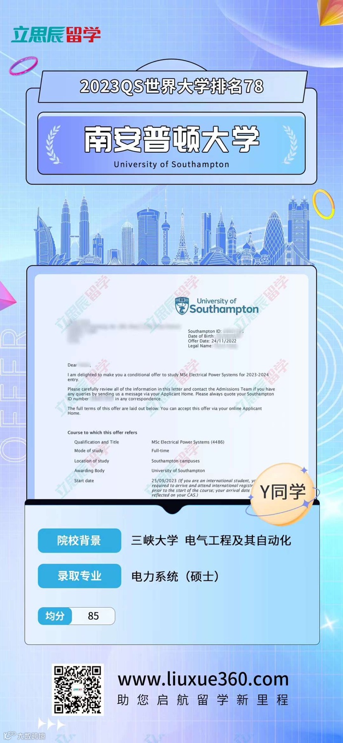 正值英国留学申请季,此时的Y同学已经收获了2枚录取,一个是QS世界排名78的南安普顿大学,一个QS世界排名28的曼彻斯特大学。