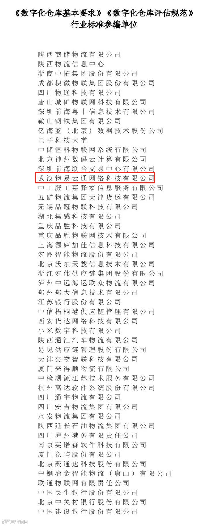 2022年6月28日,中华人民共和国国家发展和改革委员会印发了2022年第6号公告,批准发布12项推荐性物流行业标准。武汉物易云通参与起草的《数字化仓库基本要求》(WB/T 1118-2022)《数字化仓库评估规范》(WB/T 1119-2022)2项推荐性物流行业标准将于2022年7月1日正式实施。在此次物流行业标准编写中,物易云通获评先进编订单位。