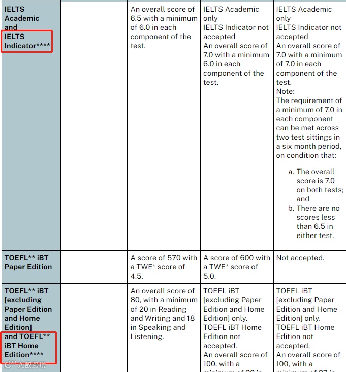 根据昆士兰大学的分数对比文件可以看出,目前学校接受托福家考和PTE Online,暂不接受IELTS Indicator和Online。