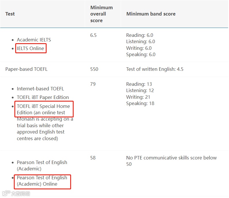 蒙纳士大学目前接受IELTS Online、托福家考和PTE Online,暂不接受IELTS Indicator。