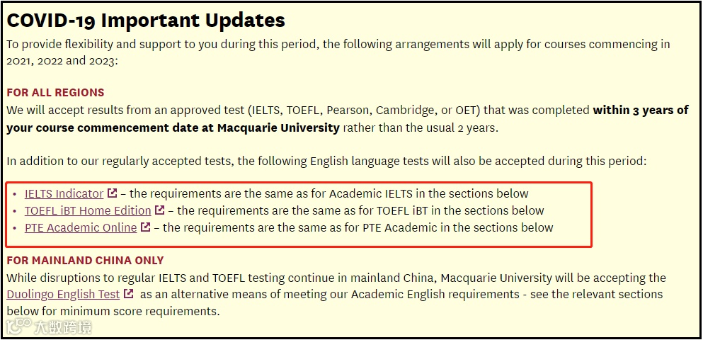 在23年申请中麦考瑞大学仍接受IELTS Indicator、托福家考和PTE Online成绩。