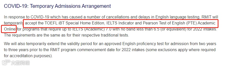RMIT在22年申请中,针对雅思要求为7.0(6.5)的课程,接受IELTS Indicator、托福家考和PTE Online成绩,但学校还未公布23年的语言政策。