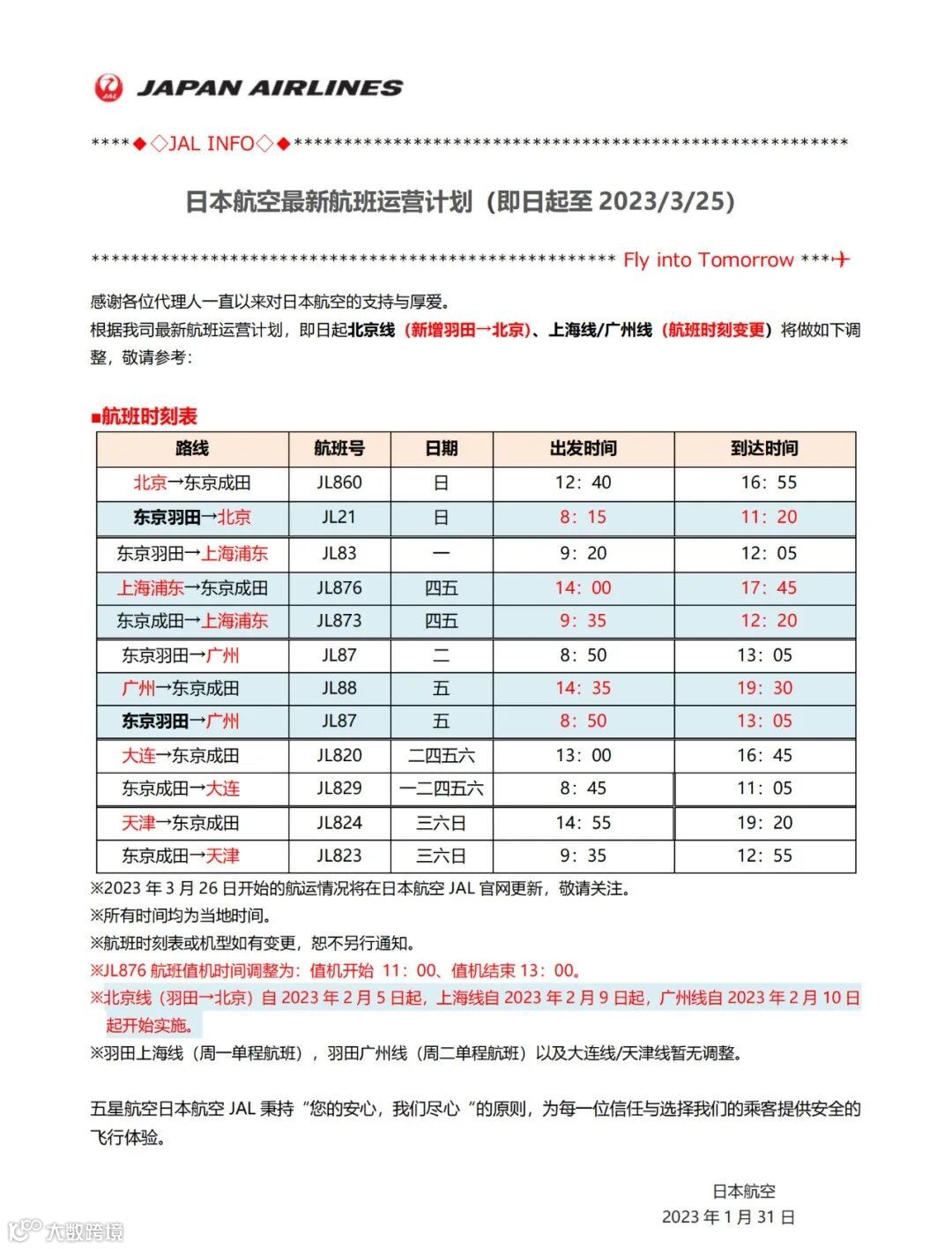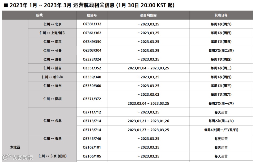 3)东北亚航班计划