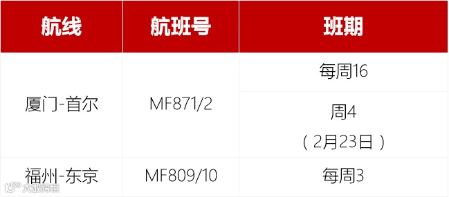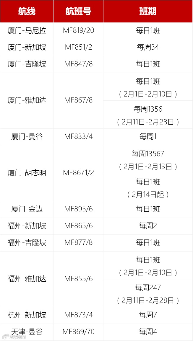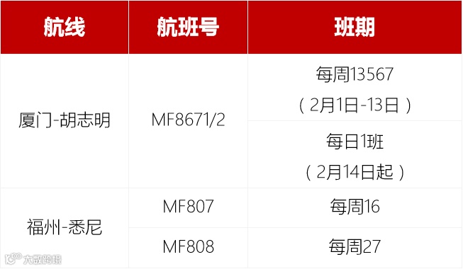 1月20日起,恢复厦门-胡志明航线,2月14日起每日1班。