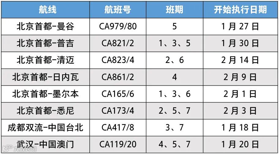 为更好满足新春出行需求,国航将恢复北京—曼谷、北京—普吉、北京—清迈、北京—日内瓦、北京—墨尔本、北京—悉尼、成都—中国台北、武汉—中国澳门航线运营,具体信息如下: