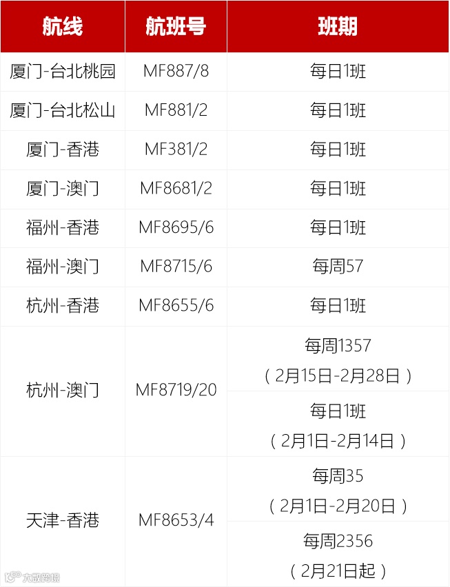 2月20日起,每周飞行五班(除周二、四)