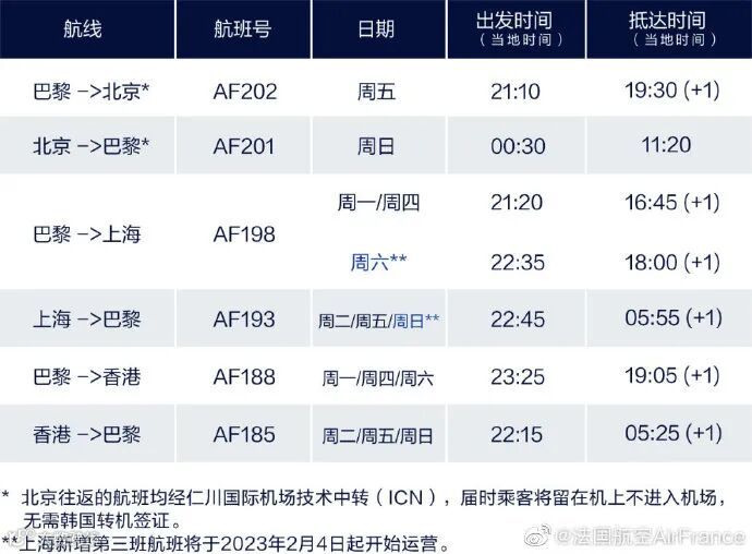 法国航空将逐步增加航班频次!预计于2023年7月1日起,每日运营巴黎戴高乐机场飞往北京、上海和香港的航班。