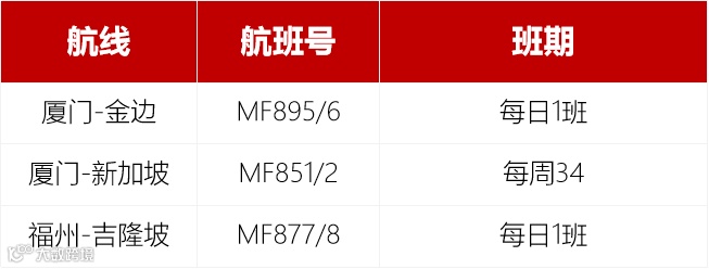 同时,厦航增飞东南亚航线。厦门-金边加密至每日1班;厦门-新加坡每周增至2班;福州-吉隆坡加密至每日1班。