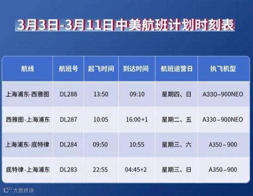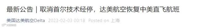 与此同时,美国达美航空微信公众号2月3日消息,达美航空自2023年3月3日起取消首尔技术经停,正式恢复中美直飞航线。
