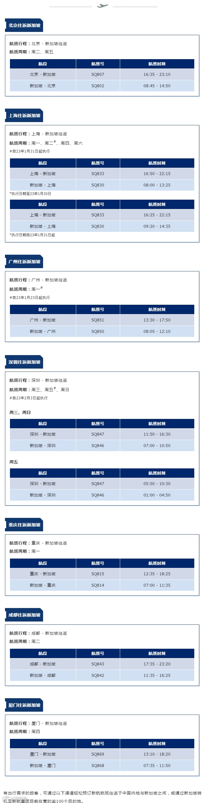 新加坡航空于2023年1月22日–23年3月25日期间在中国内地运营的航线及航班将更新如下(以下时刻均为当地时间):