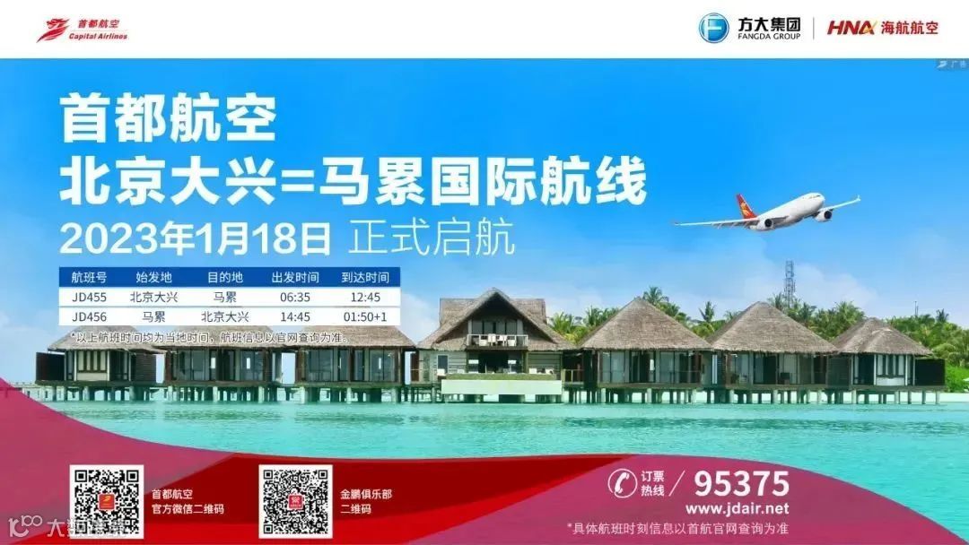 首都航空于2023年1月18日开通北京大兴=马累国际航线,该航线由宽体客机空客A330执飞,每周两班,由北京出发可直达马尔代夫。