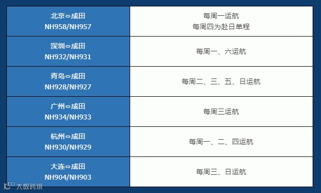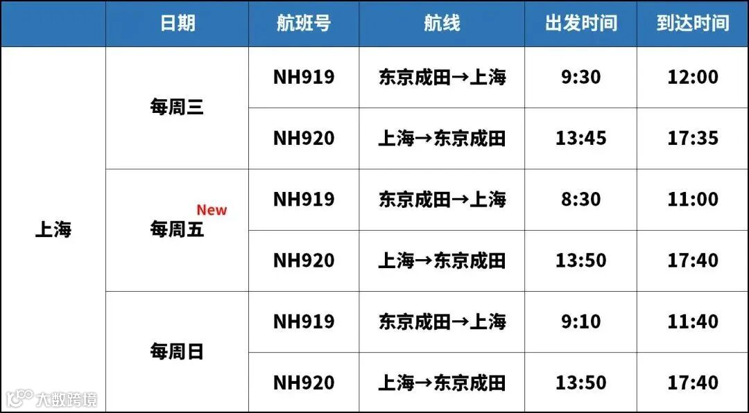 2022年12月30日起,全日空上海往返东京成田路线增至每周3班,每周三、周五、周日运航: