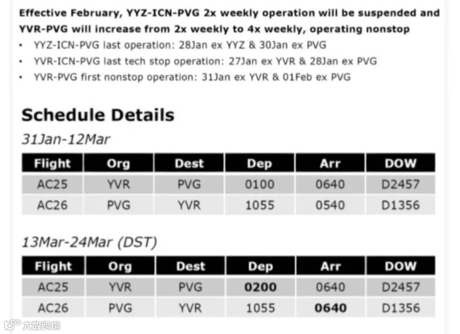 ◎ 温哥华-上海AC25/AC26航班,自1月31日起,取消首尔经停,从温哥华直飞上海;自2月1日起,从上海直飞温哥华;