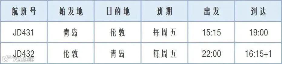 2023年1月13日至2023年3月24日期间,每周五由青岛出发直飞伦敦。