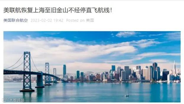 2月3日,美国联合航空公司宣布,恢复上海(浦东国际机场)和旧金山(旧金山国际机场)之间每周四次的直飞航班。首趟去程直飞航班于2023年1月28日在上海出发,飞往旧金山,回程直飞航班于2023年1月29日自旧金山飞往上海。