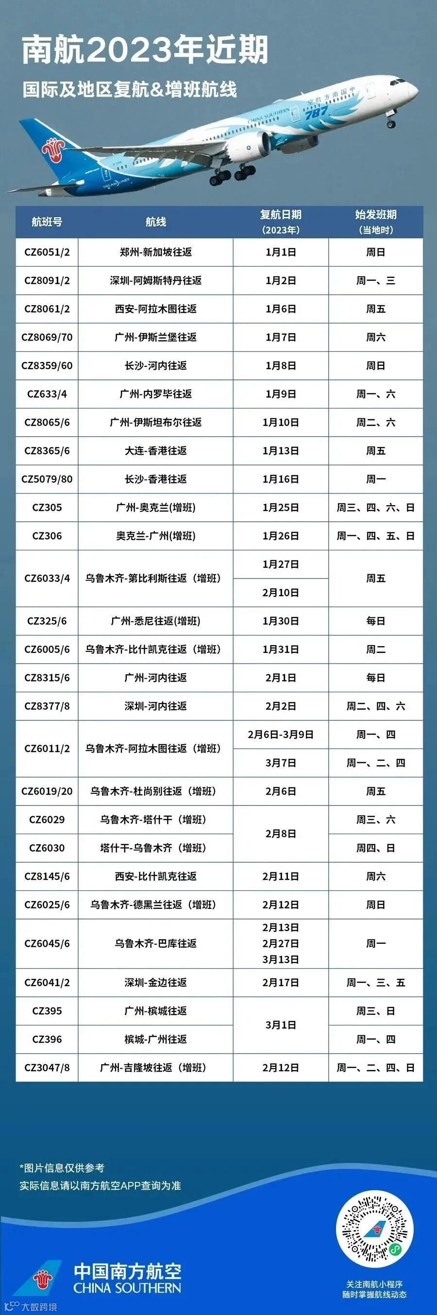 近期,南航计划新增广州至河内、乌鲁木齐至巴库、深圳至金边等多条国际及地区往返航线,同时增加乌鲁木齐至第比利斯、广州至吉隆坡、乌鲁木齐至德黑兰等往返航线班次,具体航班信息见下图: