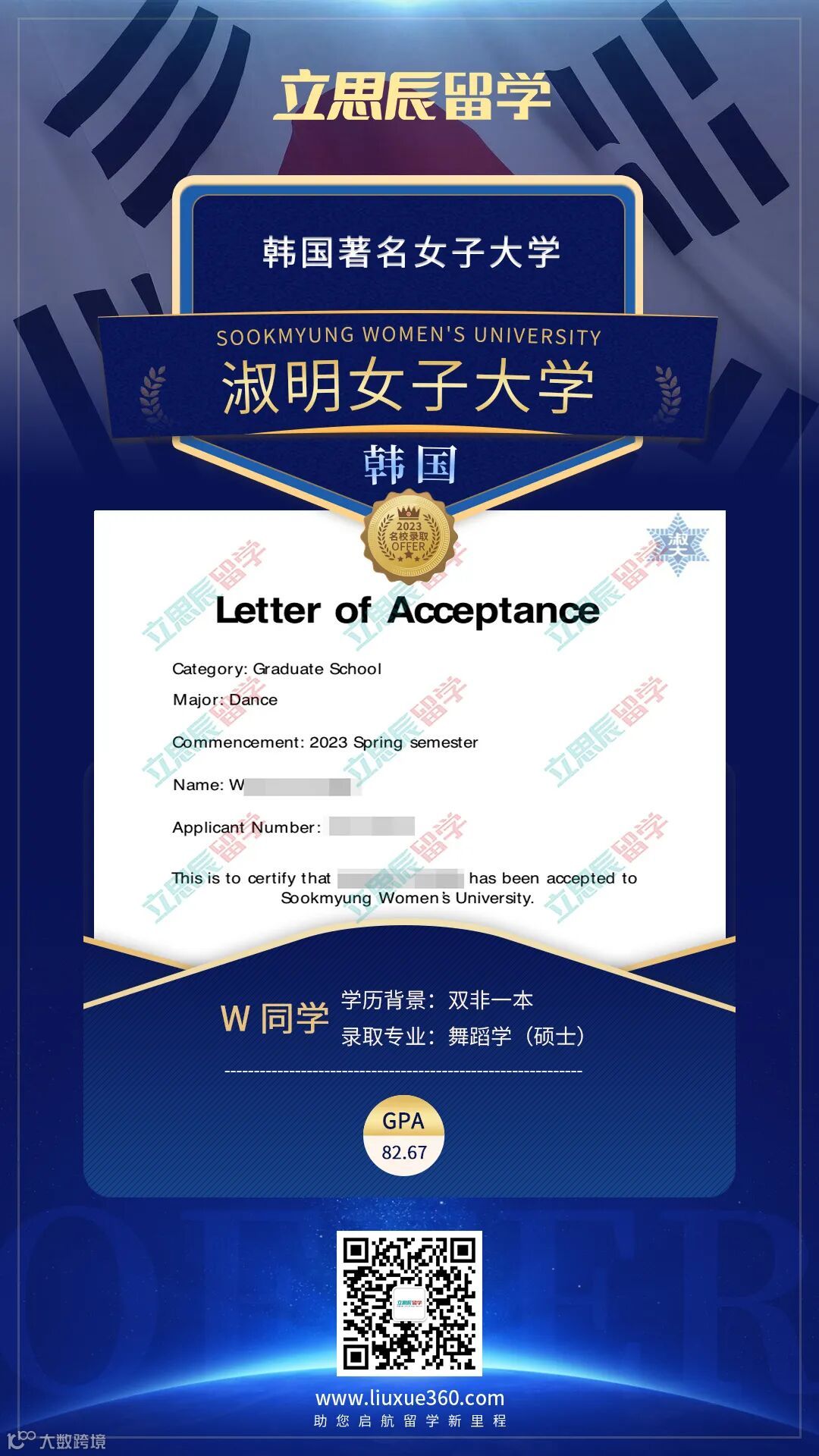 这次学生拿到的淑明女大的录取在专业上的认可度非常不错,在韩国的知名度也很高。学生很开心能去淑明女大学习!
