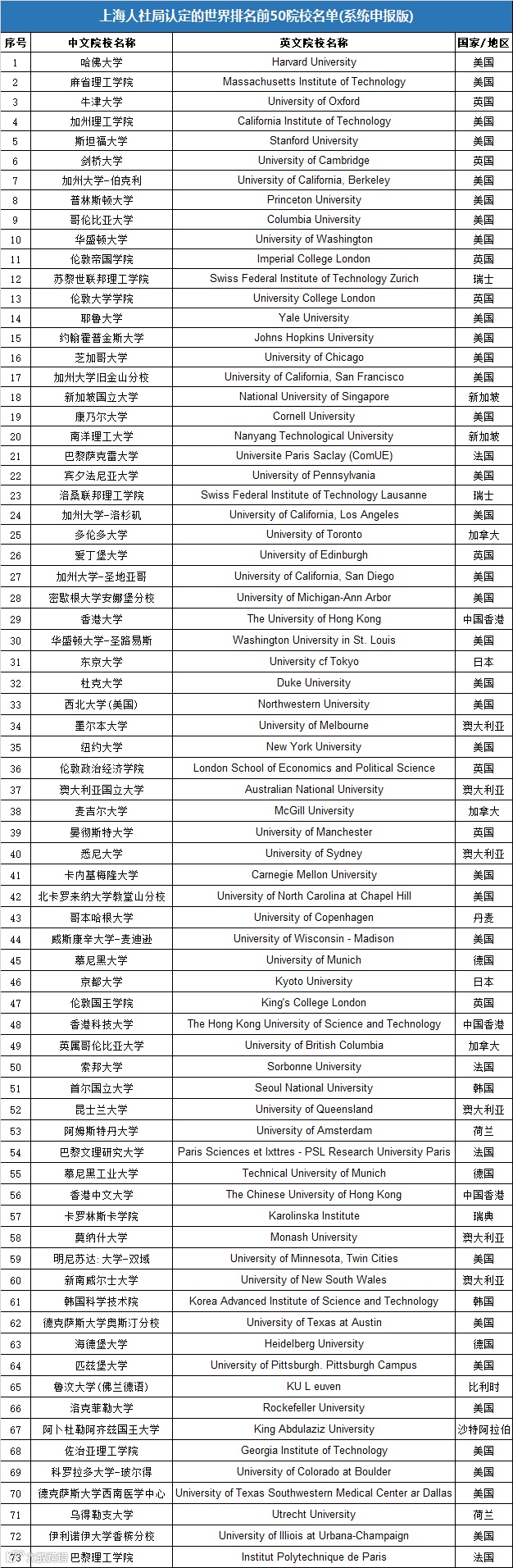 为确保万无一失,这里特意汇总了一份上海人社局认定的世界排名TOP100院校名单(系统申报版)。