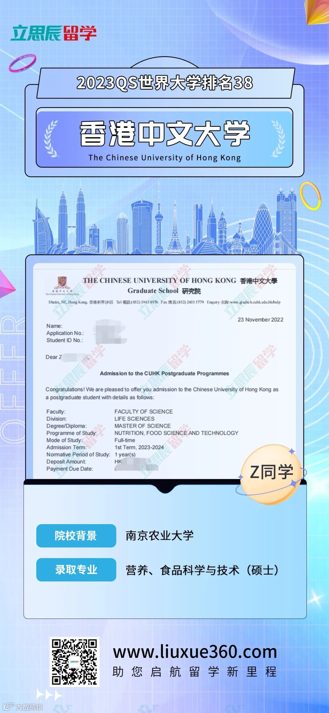 目前,我们在中国香港地区为Z同学递交了两所院校的申请,已经拿到了其中一所——中国香港中文大学的录取,是个非常不错的开始。相信接下来Z同学能收获更多的好消息呀!