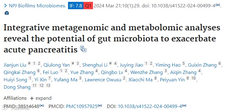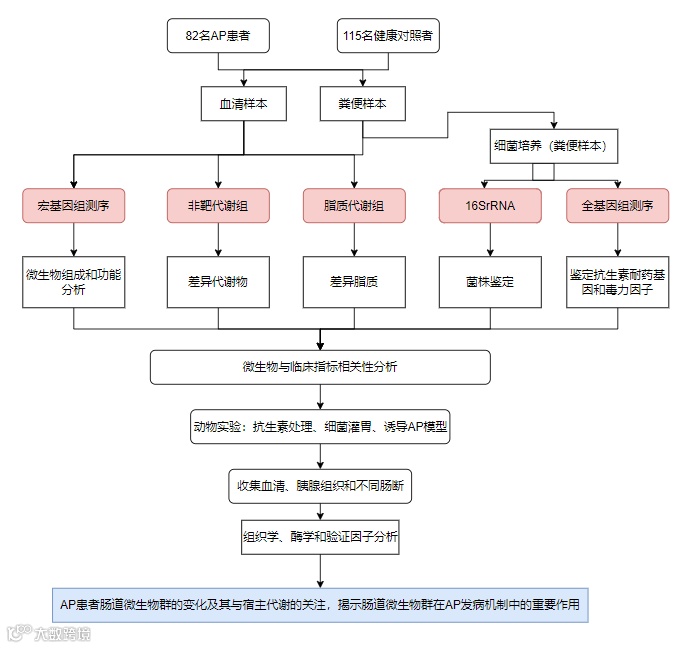 文章主题:整合宏基因组和代谢组学分析,揭示肠道微生物群在急性胰腺炎(AP)发展中的潜在作用