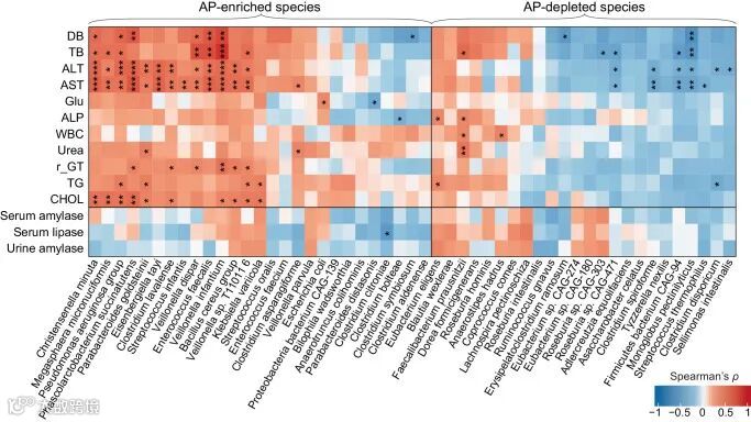 图2 AP患者肠道物种与临床变量之间的相关性热图