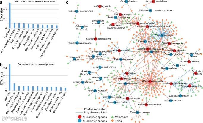 图3 肠道物种与血清代谢物、脂质的相关性网络